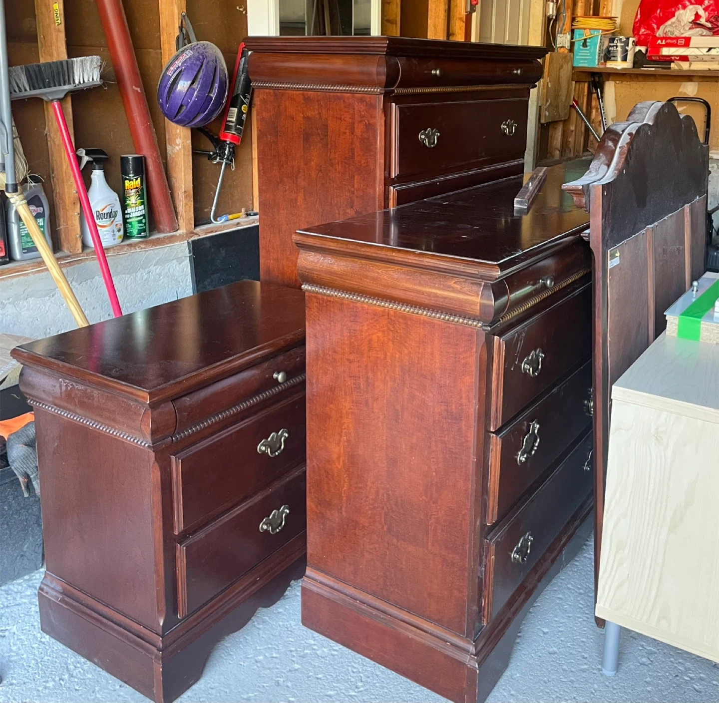 Selling a bedroom set that includes 2 nightstand, 2 dresser, and mirror. The set is a matching dark wood colour and features ornate handles. Perfect for adding a touch of traditional elegance to your bedroom!