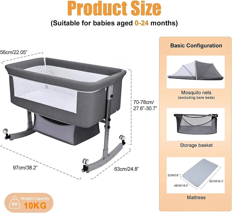 10Transforms easily between Bassinet, Bedside Sleeper, and Rocking Cradle modes, giving your baby a comfortable sleeping space from newborn to infant stage. Zip down the side panel to attach the bassinet securely to your bed. Perfect for nighttime care—moms can easily check on, feed, or comfort their baby without leaving the bed. Features 4 adjustable height levels to fit most adult beds. The incline option helps reduce milk choking and improves comfort after feeding. Quick-release screw system ensures added stability and prevents shaking. Equipped with a removable sunshade mosquito net, large-arc cradle base, silent wheels with brakes, and a spacious storage basket—combining practicality, safety, and convenience in one.