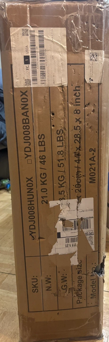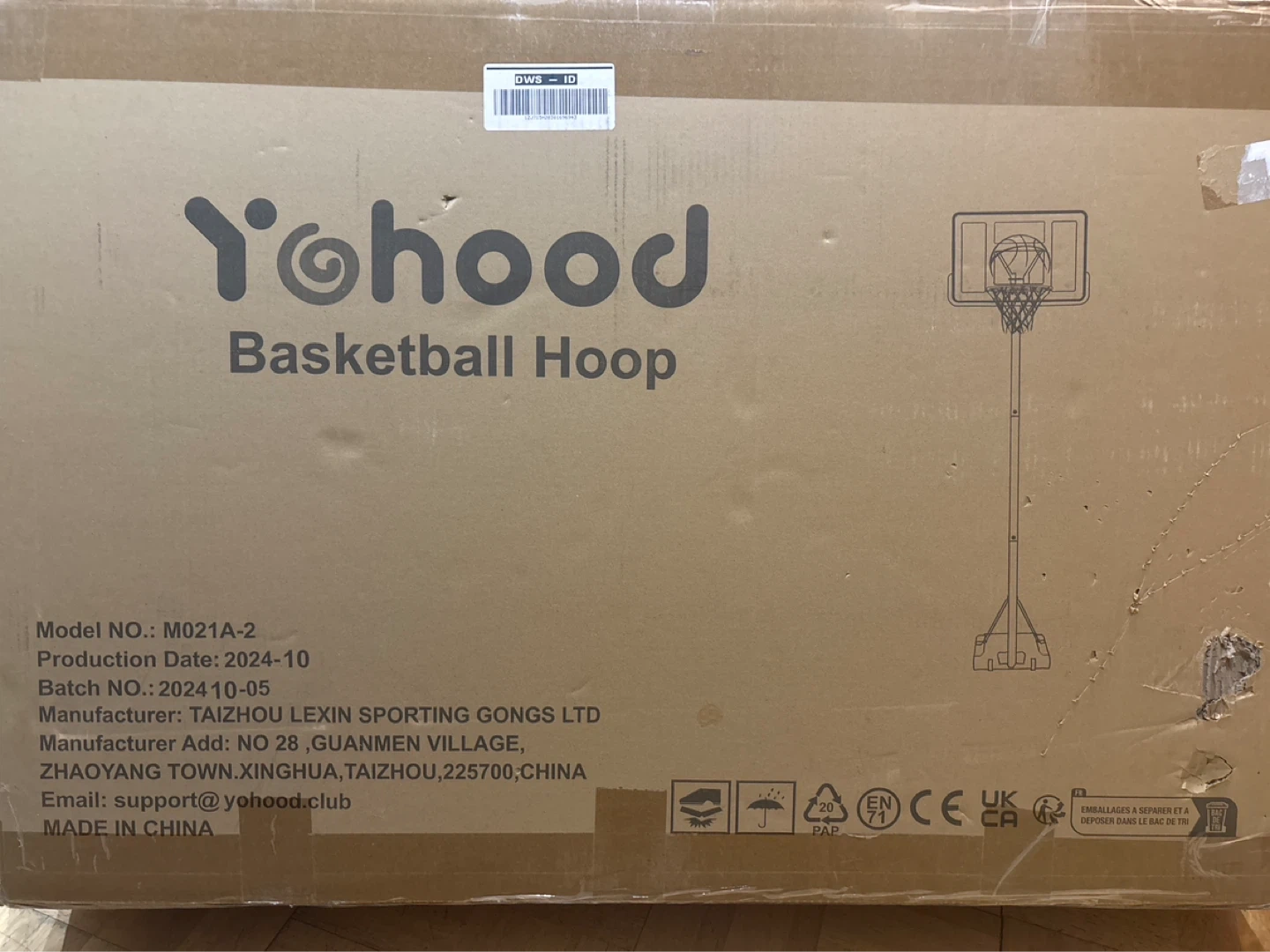 This is a Yohood basketball hoop. Model NO.: M021A-2. Production Date: 2024-10. Batch NO.: 202410-05. Manufactured by TAIZHOU LEXIN SPORTING GONGSLTD. [Damaged box, but never opened] Adjustable height range of 4.43 feet to 10 feet.