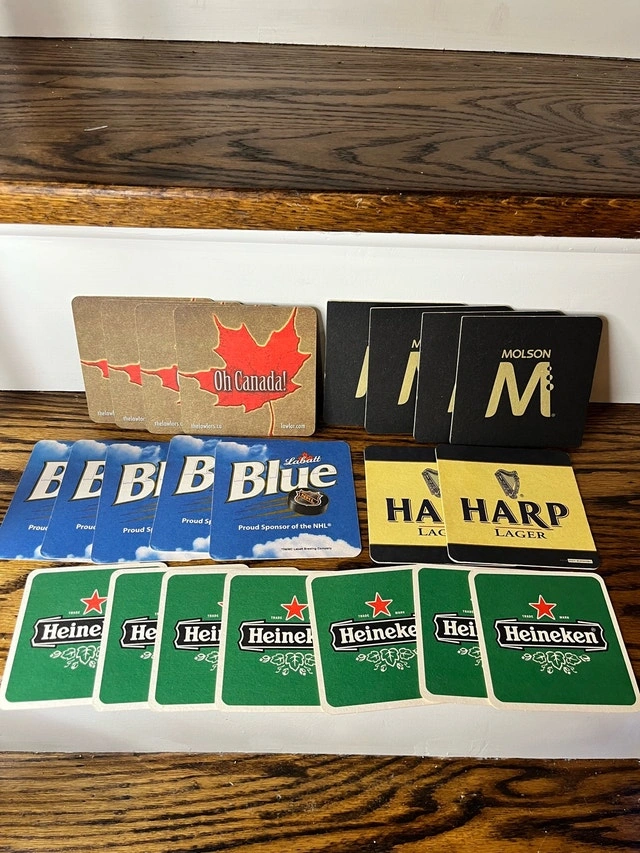 142I am offering a variety of beer coasters from different breweries, including Labatt Blue, Molson, Harp Lager, and Heineken, perfect for any home bar or collection. These coasters are in good condition to protect your furniture while adding a touch of brewery flair. Check out my other listings for more cool stuff!