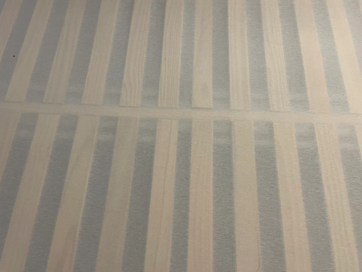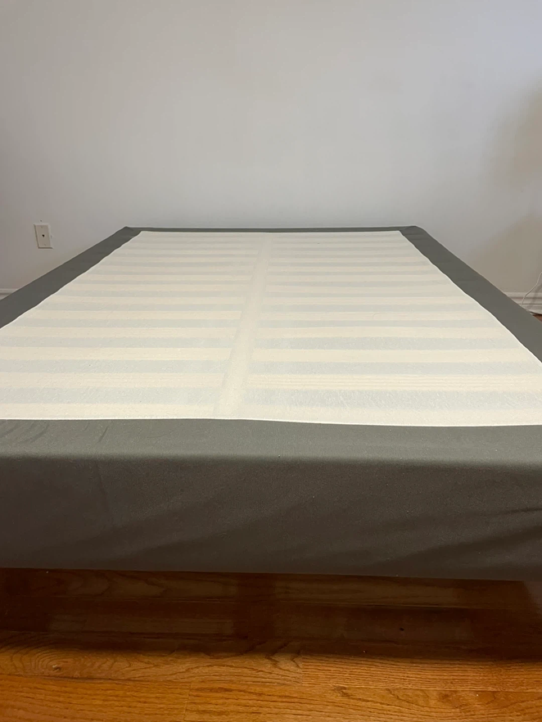 Queen size box spring with a grey upholstered fabric cover. Provides a sturdy base for your mattress. Slatted design for ventilation.