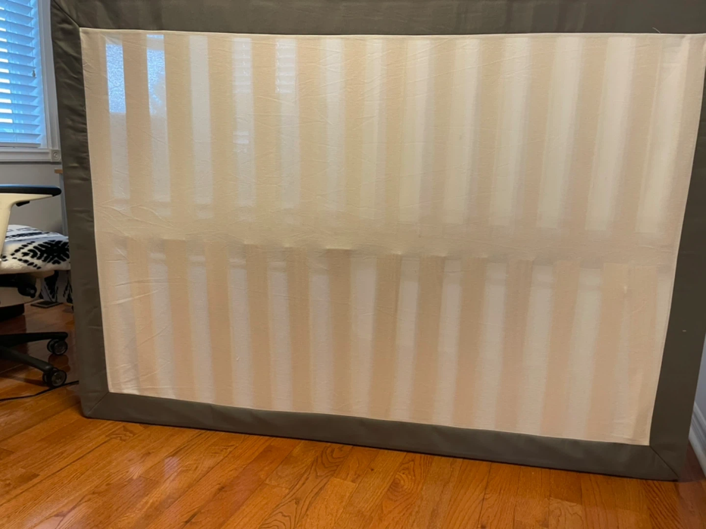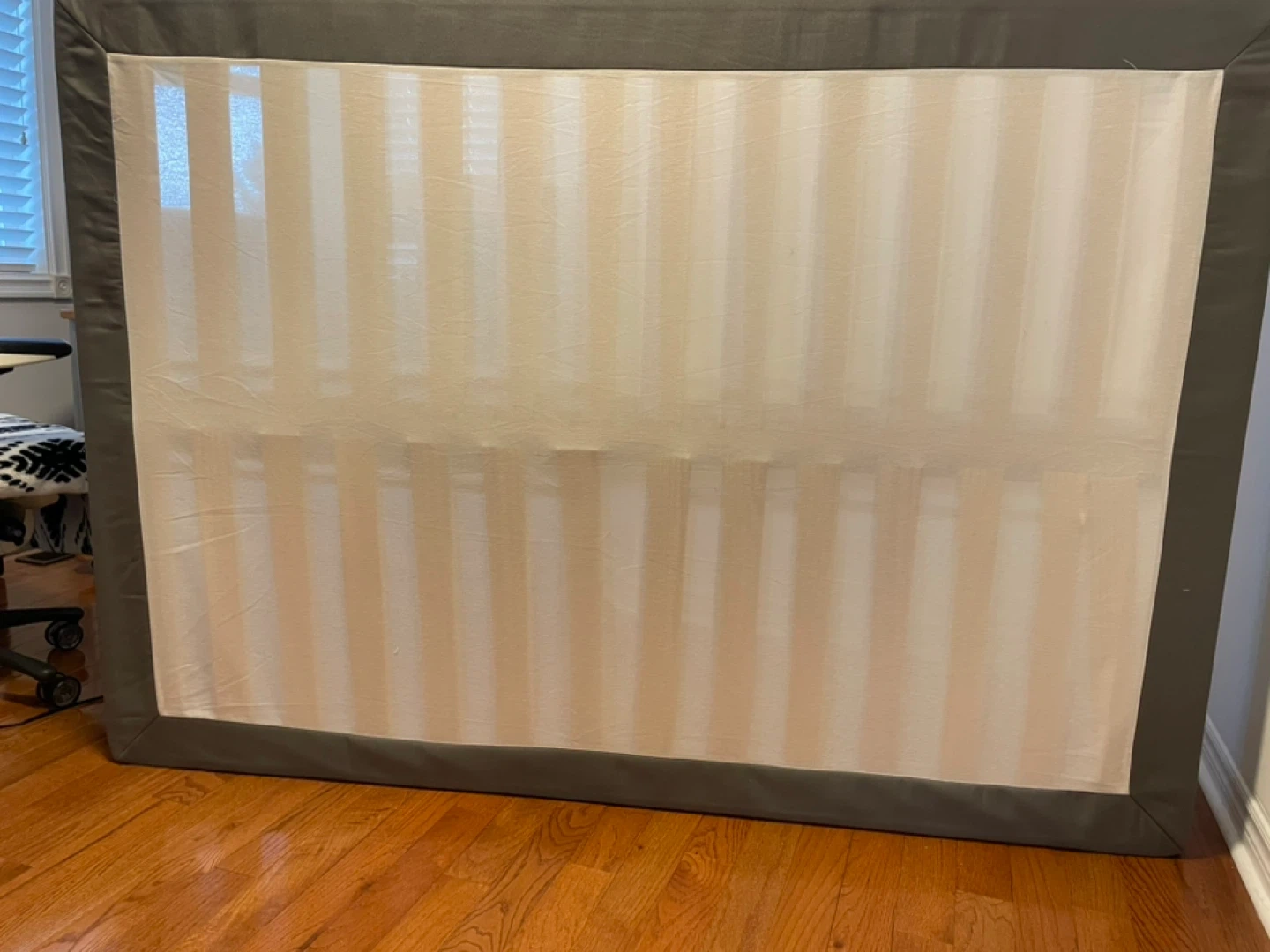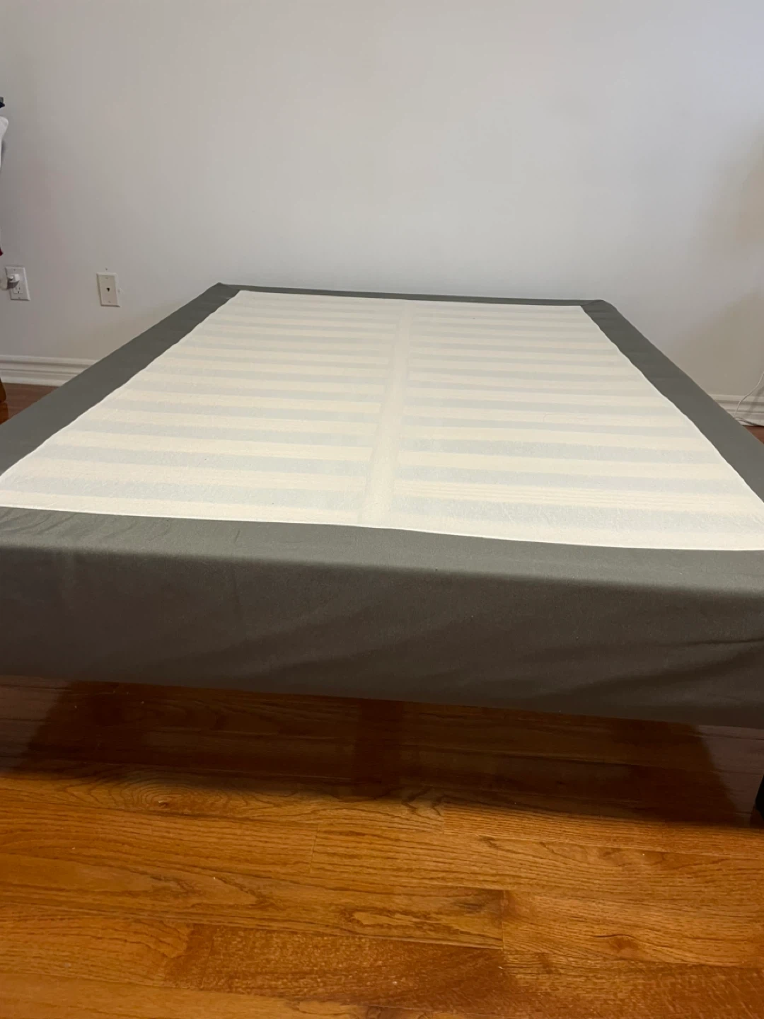 Queen size box spring with a grey upholstered fabric cover. Provides a sturdy base for your mattress. Slatted design for ventilation.