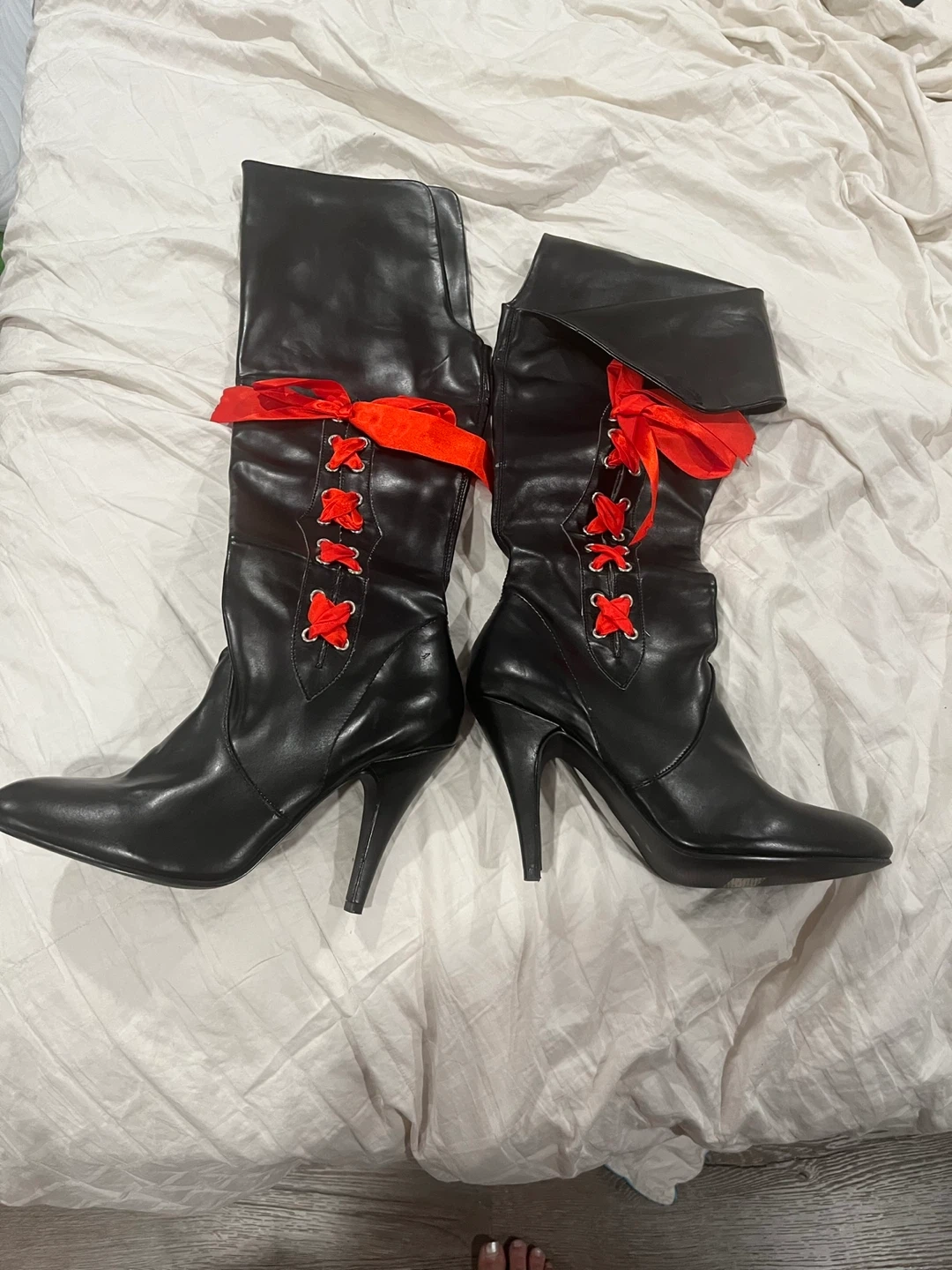 Black faux leather tall boots with red lacing and ribbon ties. These boots have a pointed toe and a stiletto heel. They're great for costumes or making a statement!