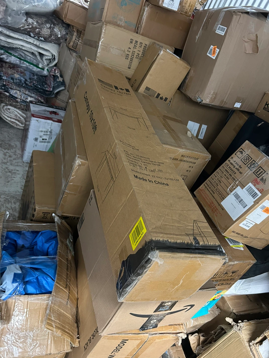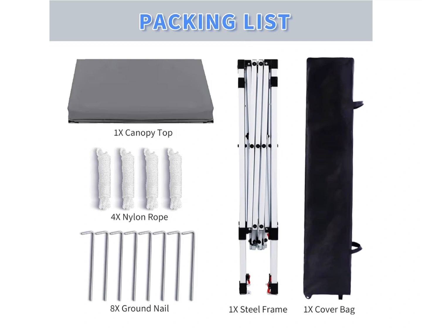 This is a 10x10 ft grey canopy tent. It offers 3 adjustable heights: 5.7 ft, 5.4 ft, and 3.9 ft. The canopy is made of fireproof and UV sun protection fabric. It includes a steel frame, canopy top, 4 nylon ropes, 8 ground nails, and a cover bag. Net weight is 37.6 lbs.