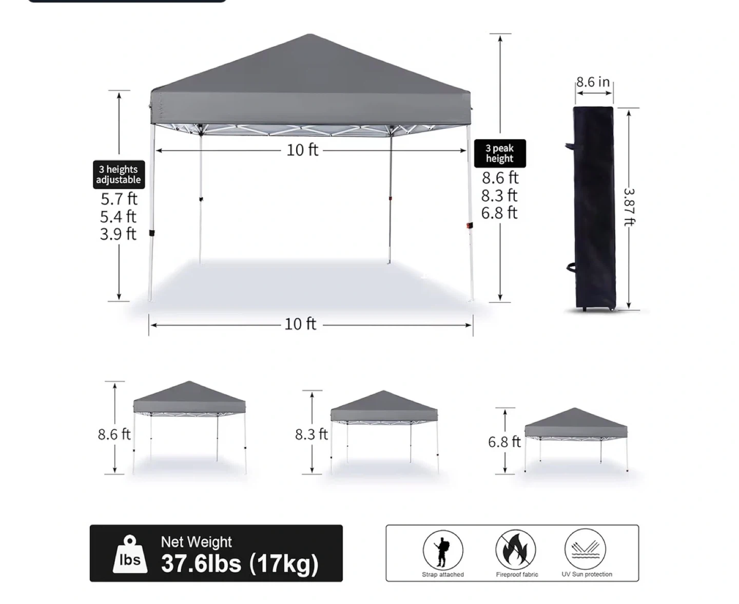 This is a 10x10 ft grey canopy tent. It offers 3 adjustable heights: 5.7 ft, 5.4 ft, and 3.9 ft. The canopy is made of fireproof and UV sun protection fabric. It includes a steel frame, canopy top, 4 nylon ropes, 8 ground nails, and a cover bag. Net weight is 37.6 lbs.