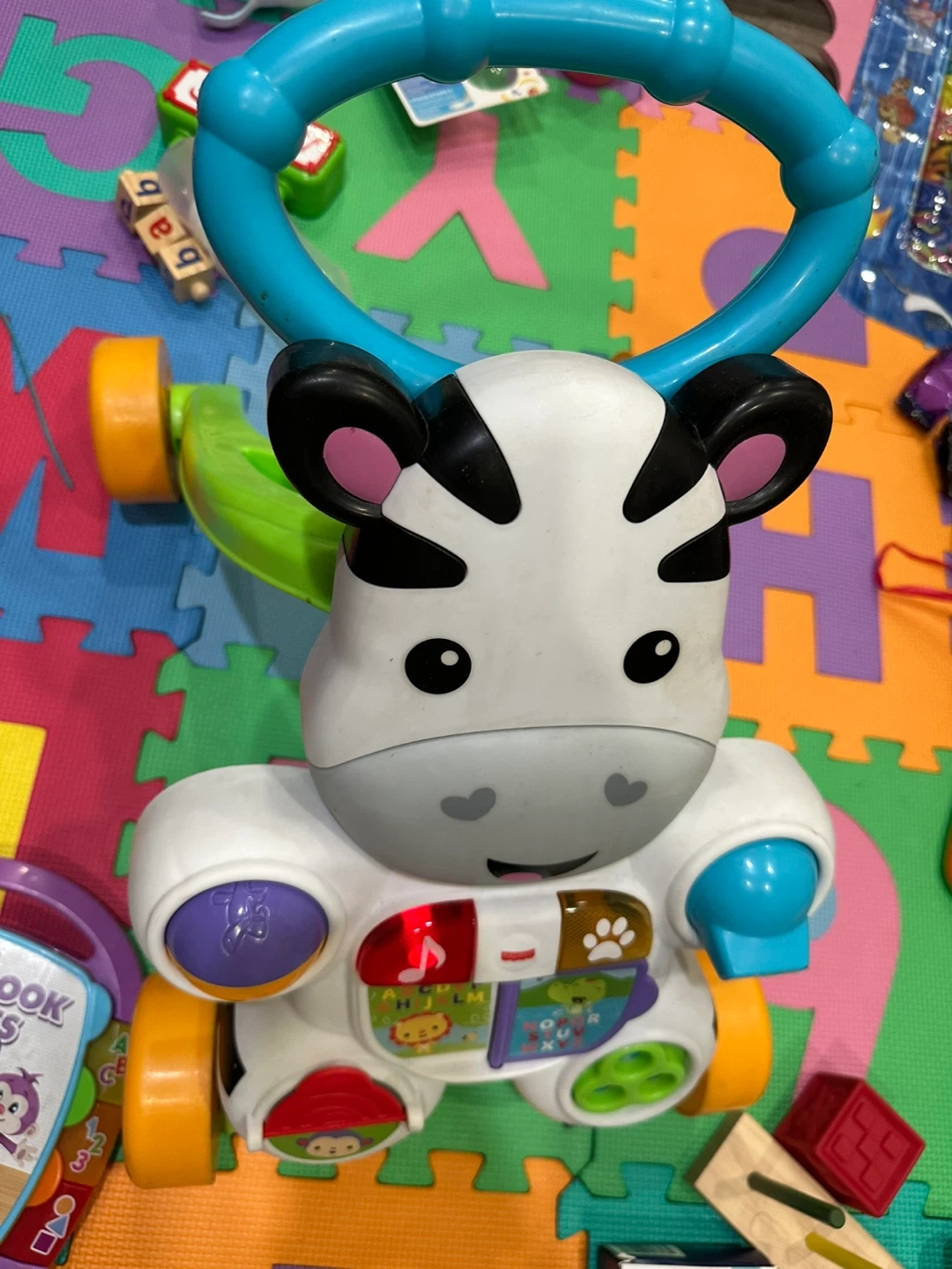This Fisher-Price zebra walker helps little ones learn to walk and play. It has colourful buttons and interactive activities. It's designed for babies and toddlers learning to stand and take their first steps.