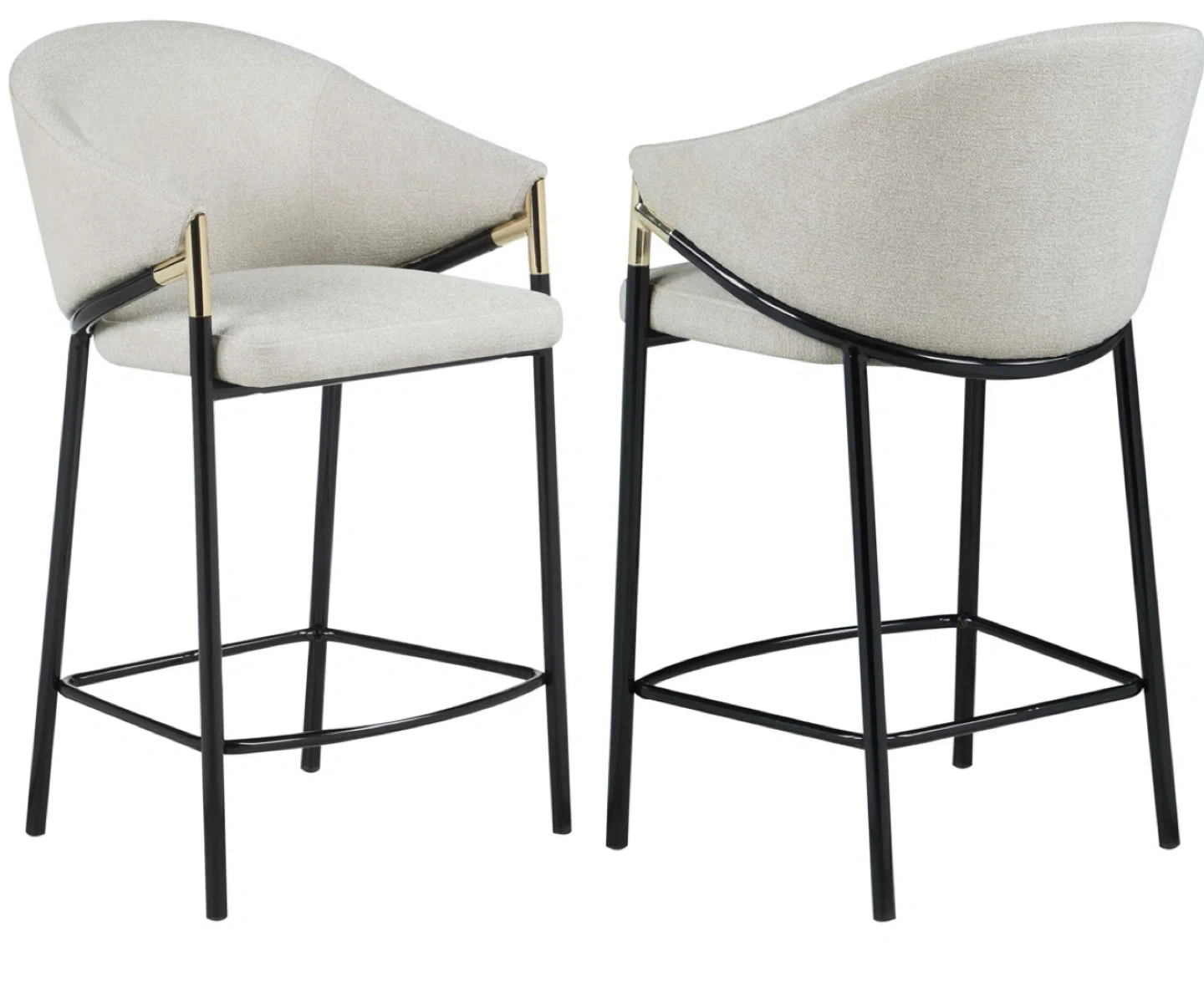 Cream fabric upholstered bar stools with black metal legs and gold accents. Seat height is 26.75". Overall height is 36.75".
