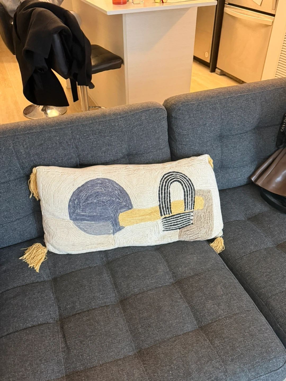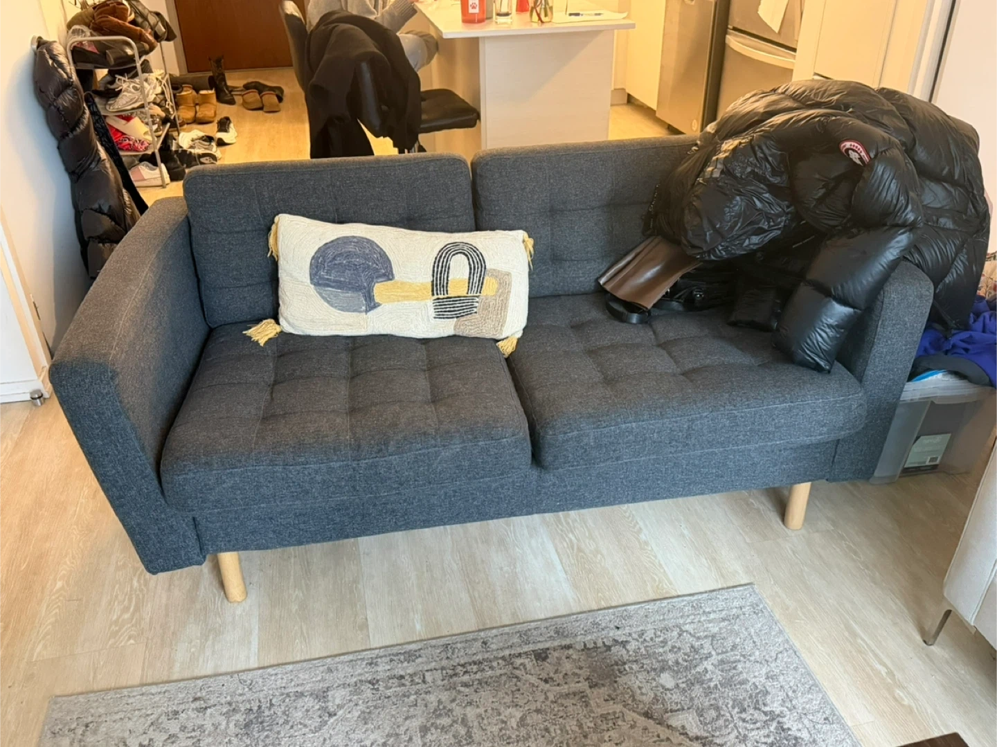 This is a comfy grey two-seater sofa. It comes with one decorative lumbar pillow featuring a geometric design. The sofa has tufted seat cushions and wooden legs. The arm of the couch is a bit wiggly and needs to be adjusted, but other than that couch is in good condition.