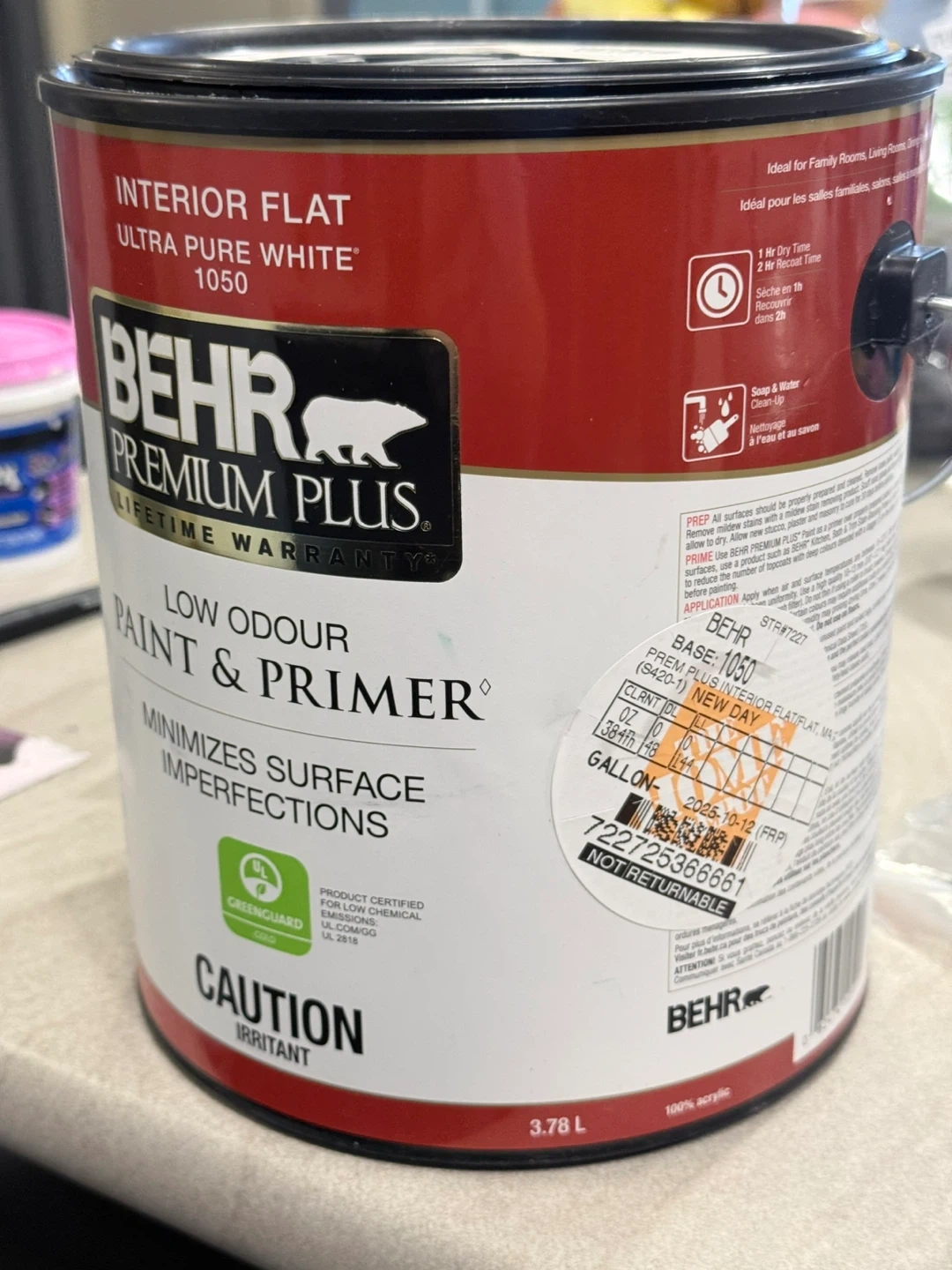 10Selling a can of Behr Premium Plus interior flat paint in Ultra Pure White! It's a low odour paint and primer that minimizes surface imperfections. Ideal for family rooms, living rooms, and dining rooms. The can is 3.78 L (1 Gallon)