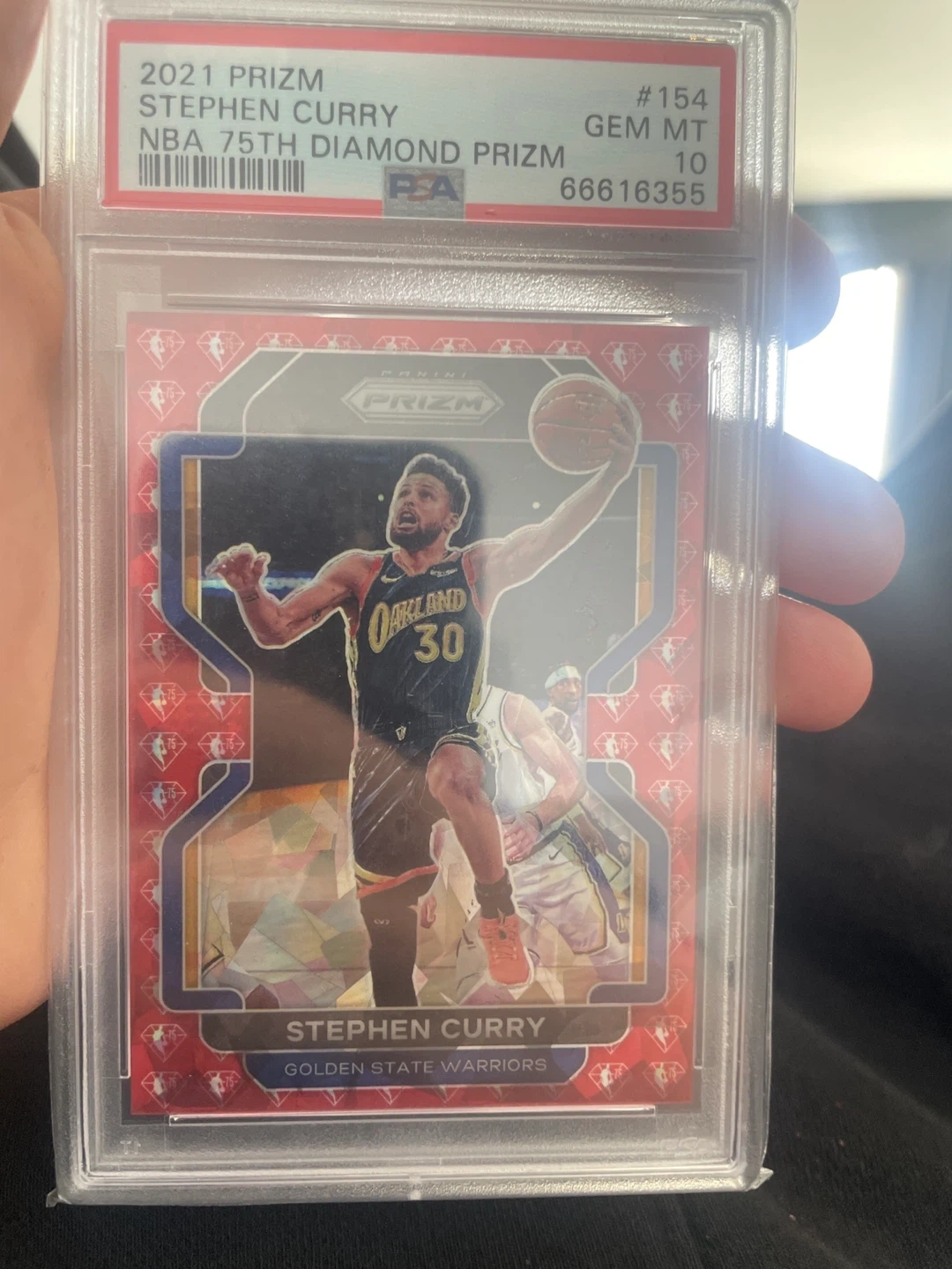 2021 Panini Prizm Stephen Curry NBA 75th Diamond Prizm trading card. Graded GEM MT 10 by PSA. Card number is 154. Includes original PSA grading case.