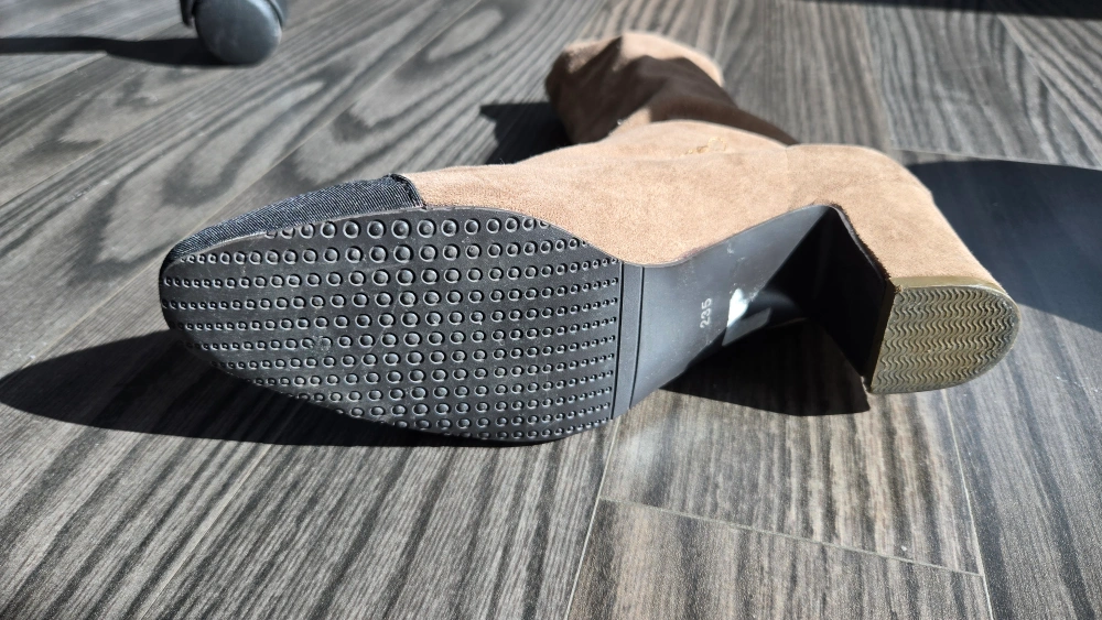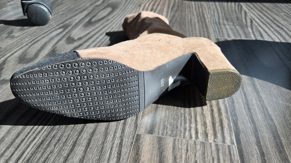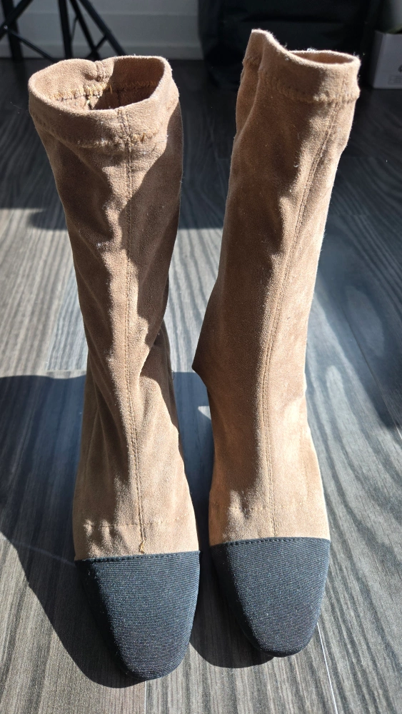 Selling a pair of ankle boots in a lovely beige colour! They feature a block heel and a black toe cap. The size is 235, which is approximately a US size 6.5. These boots are in great condition and would be a stylish addition to any wardrobe 235cm
