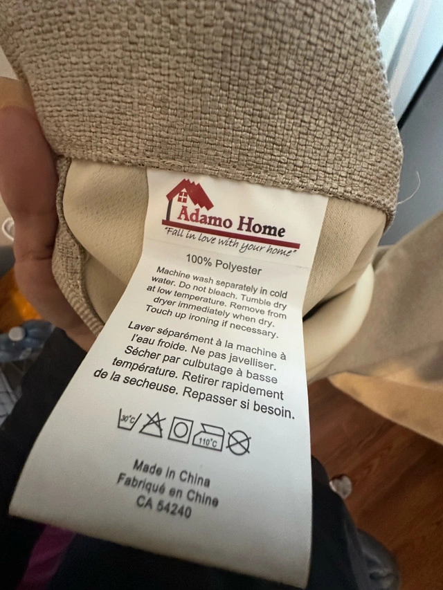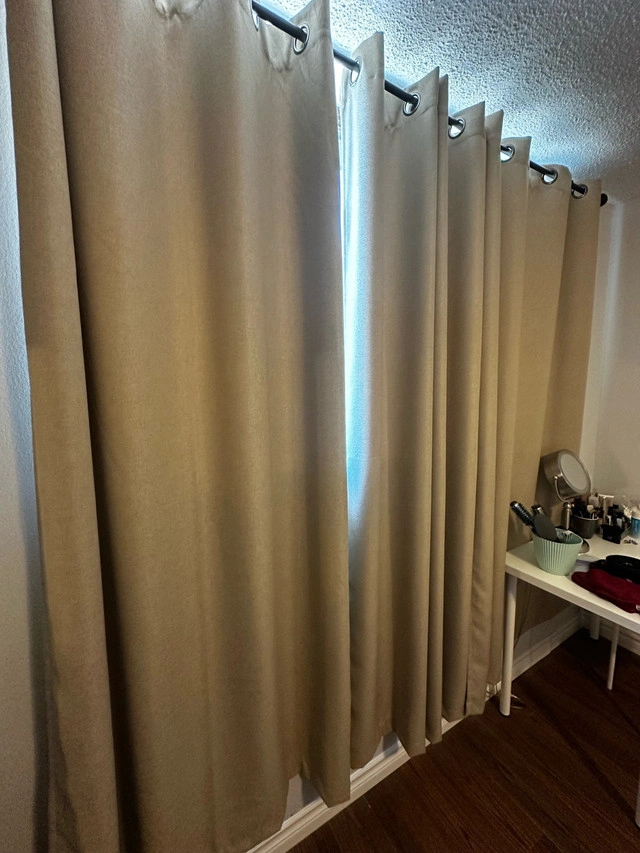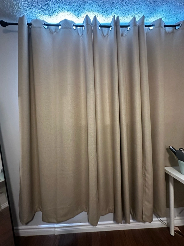 68These are Adamo Home beige blackout curtains that block out sunlight effectively. These curtains have been used, but are in good condition, ready to enhance any room with their light-blocking capabilities. They are 100% polyester and machine washable. * Brand: Adamo Home * Colour: Beige * Material: 100% Polyester * Type: Blackout curtains