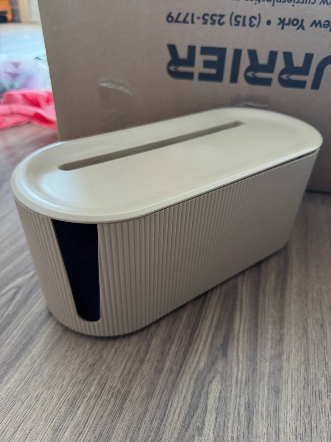81Selling a cable management box in a neutral beige colour. It's in great shape and ready to help you organize those messy cords!