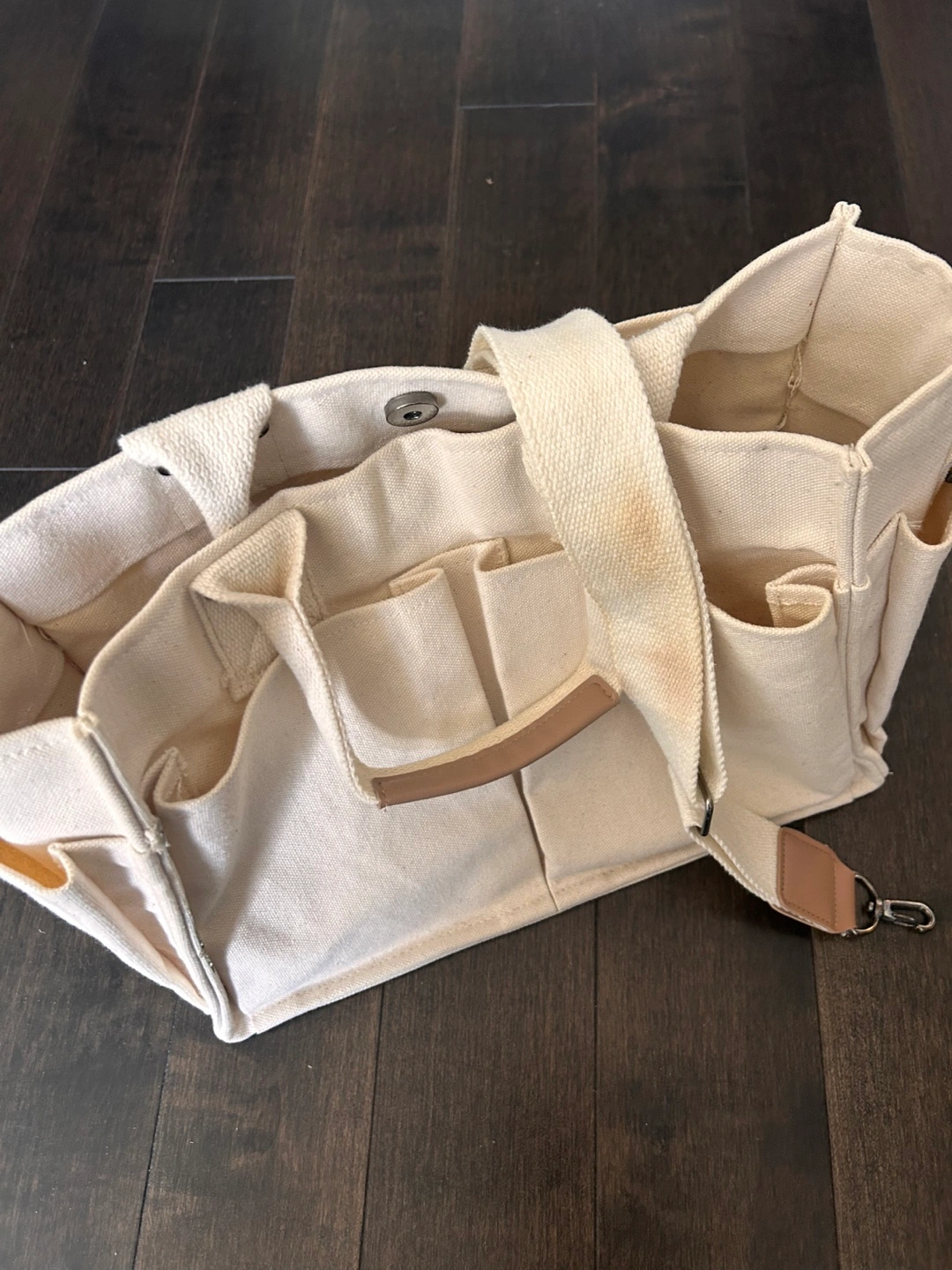A beige canvas tote bag with multiple pockets and brown accents. It's a sturdy bag perfect for carrying all your essentials. There is some staining on the strap.