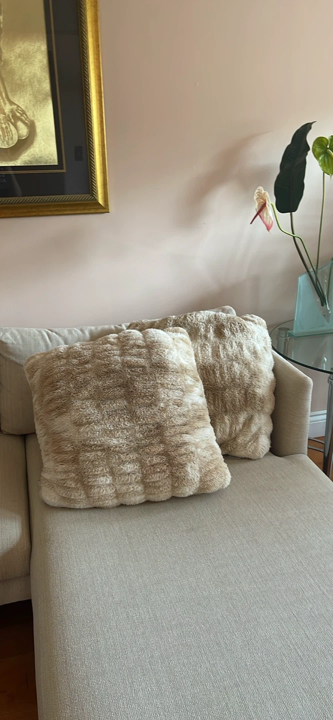 Two beige faux fur throw pillows in great condition! They're super soft and add a cozy touch to any room. Perfect for your couch or bed!
