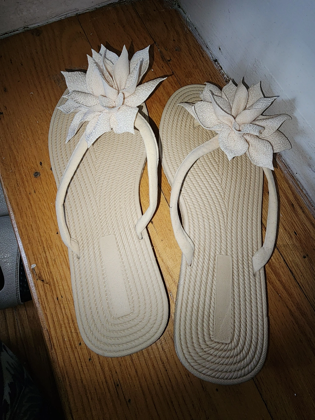 238Pair of beige flip flops. Features a large fabric flower embellishment on each strap. Rope-like texture on the sole. Comfortable summer footwear.