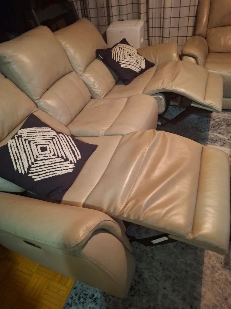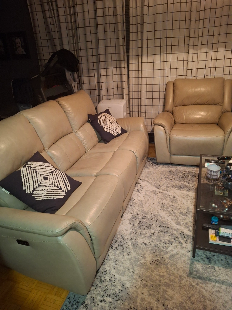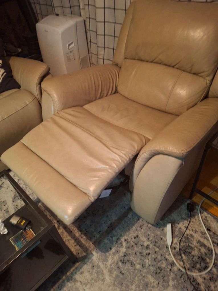 10Power reclining sofa and armchair set. Beige authentic leather upholstery. Excellent for relaxation. Armchair is manual reclining while the sofa is power. In excellent condition. Available for pick up only.