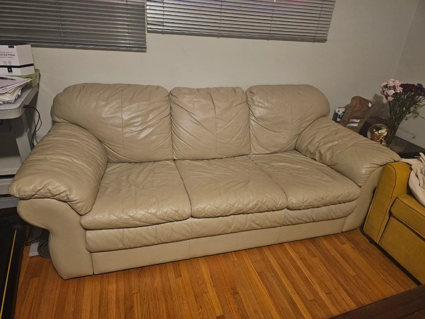 This is a used, beige leather couch, perfect for a living room or den. The couch features a three-cushion design and is made from durable leather material. While it shows signs of wear, it remains comfortable and functional. Here are some details: * Colour: Beige * Material: Leather * Style: Traditional * Number of Cushions: 3 Don't miss out on this opportunity to add some comfort to your home. By the way, if the ad is up, it's still available! Pick up in Lower Mount Royal . Please check out more of my items and get a good deal.