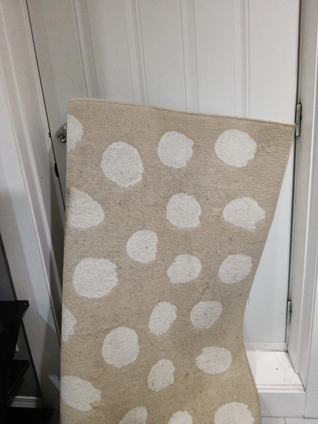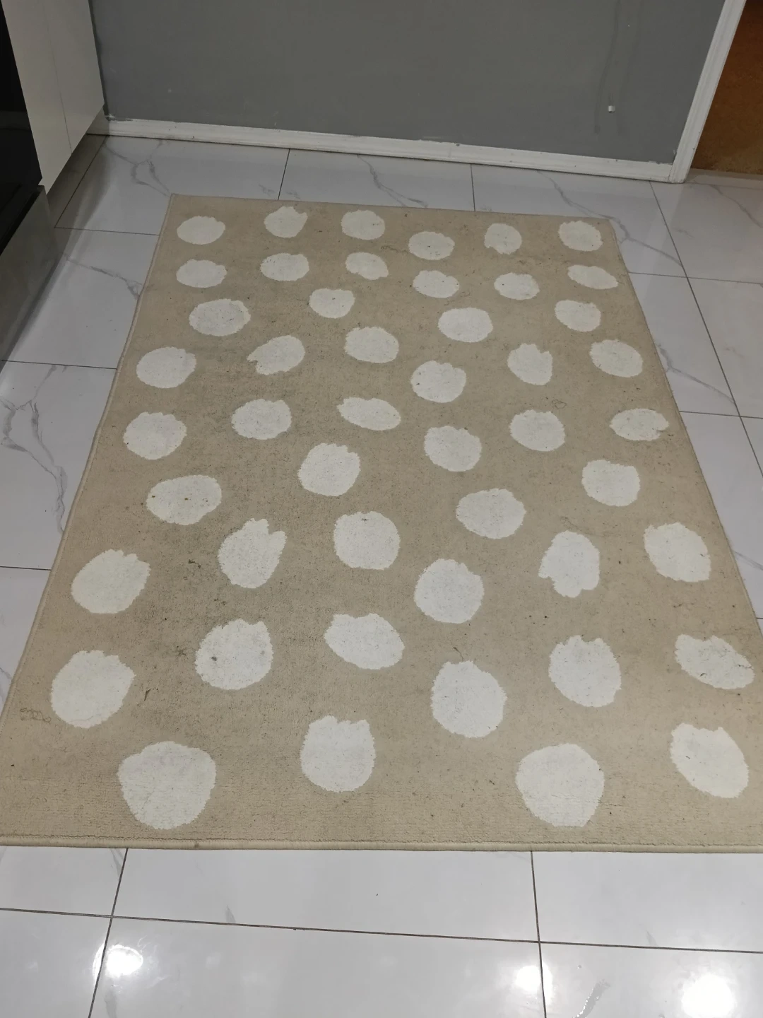 5Selling a beige rug with a pattern of white spots. It's a cozy addition to any room. Perfect for adding a touch of warmth to your floors!
