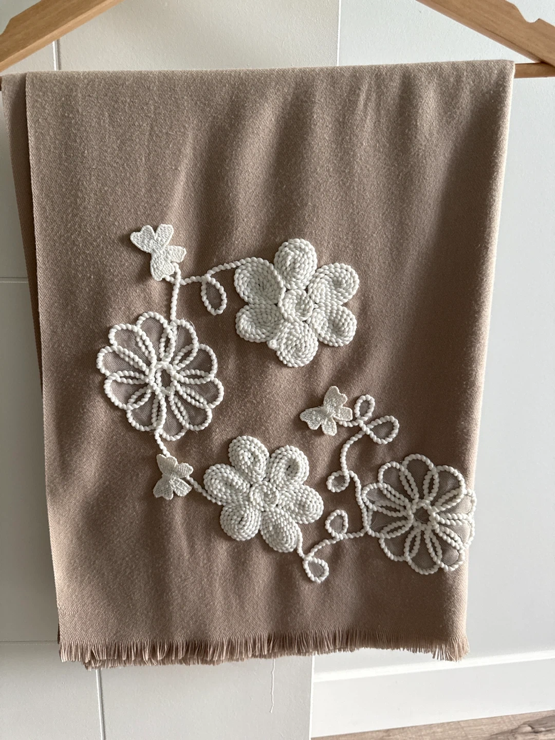 10A lovely beige scarf featuring delicate white floral embroidery. The scarf has a soft texture and a fringed edge, adding a touch of elegance to any outfit. It's in great condition and ready to find a new home!