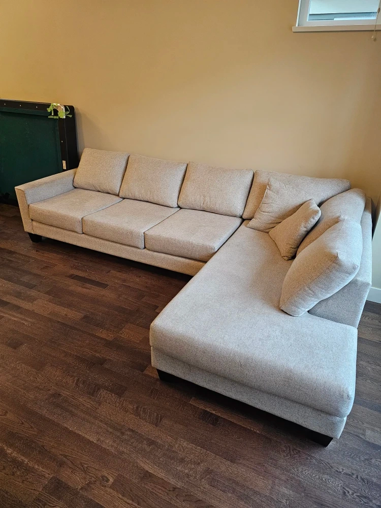 65Selling a comfy customized sectional sofa! It's in great shape and ready for a new home. The dimensions are approximately 297 cm in length and 188 cm in width, with a height of about 96.5 cm. Perfect for lounging and relaxing in your living room. Original price is over $2,200.
