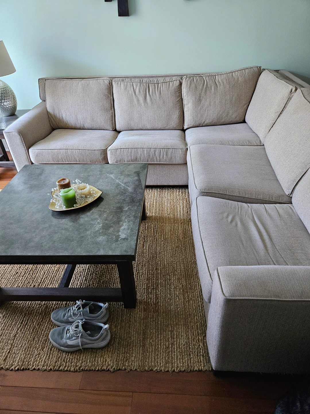 Beige sectional sofa. Includes three-seater and chaise lounge. Reasonable condition with slight wear. Concrete coffee table in great shape and if you'd like the area rug, you can have that also. I will be keeping the end table but must go as new furniture arriving soon. Must be able to pick up.