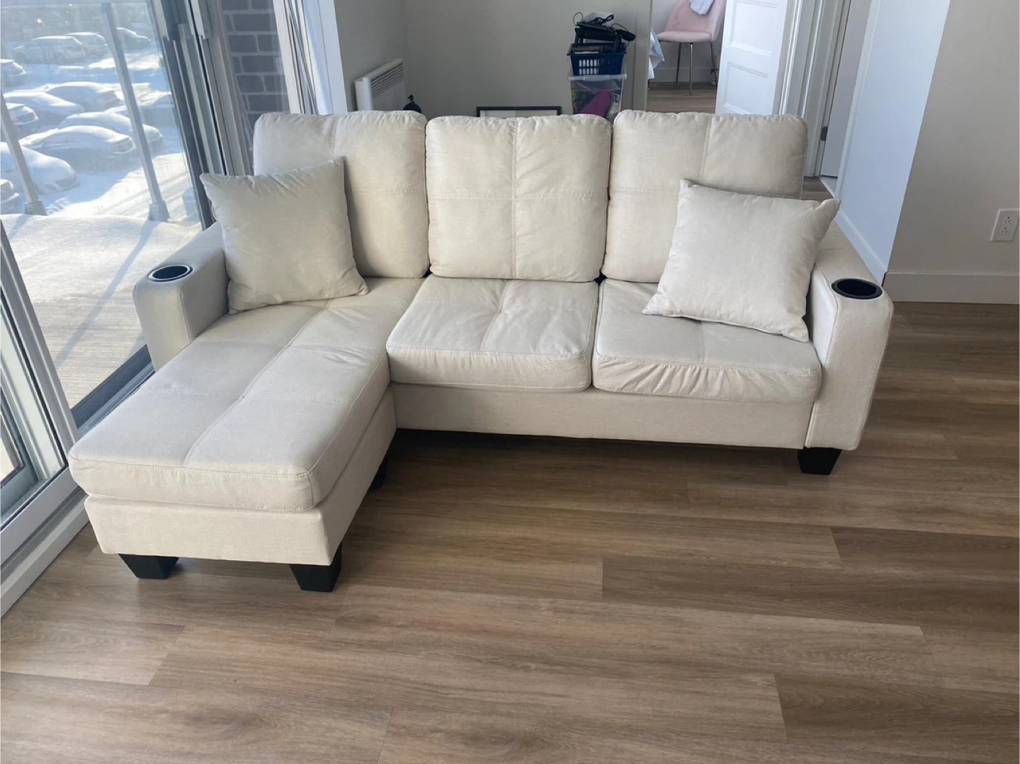 Selling this brand new comfy beige sectional sofa! It features a chaise lounge and includes throw pillows. It also has convenient cup holders on the side Available in grey, black & beige!