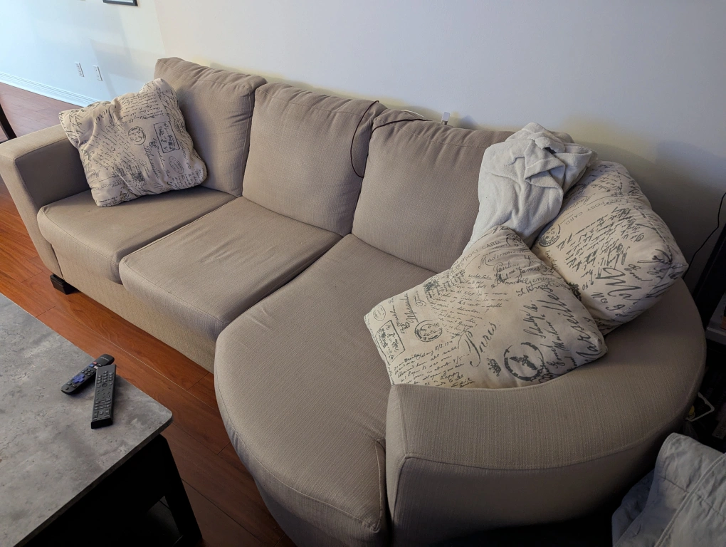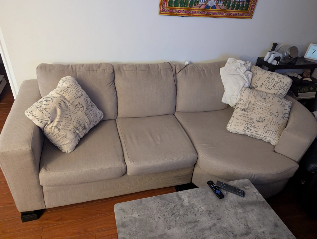 13Comfortable beige fabric sectional sofa. Three-seater with curved chaise. Includes two decorative pillows. Excellent condition, custom-made couch Asking $400 (Negotiable) The couch can be disasembled in two piece for easy transportation. Pillows are included for free