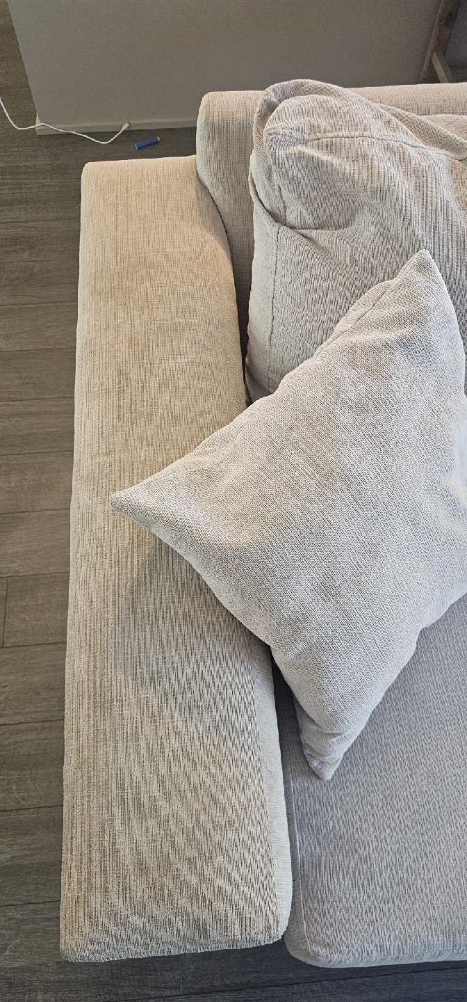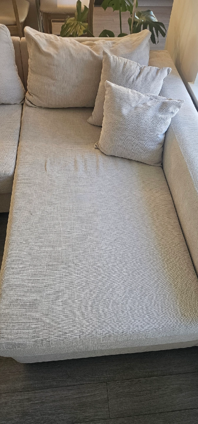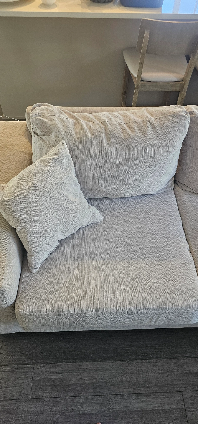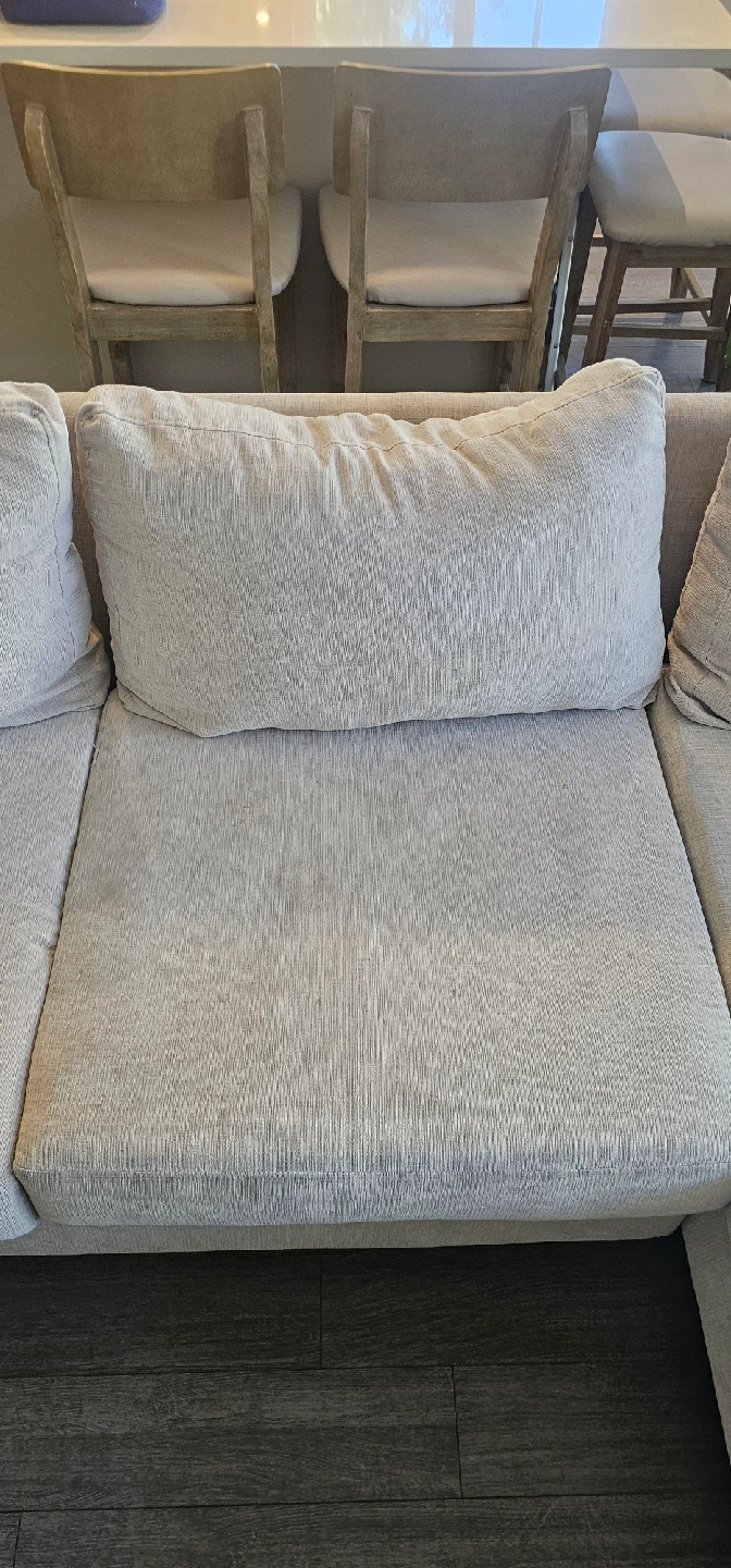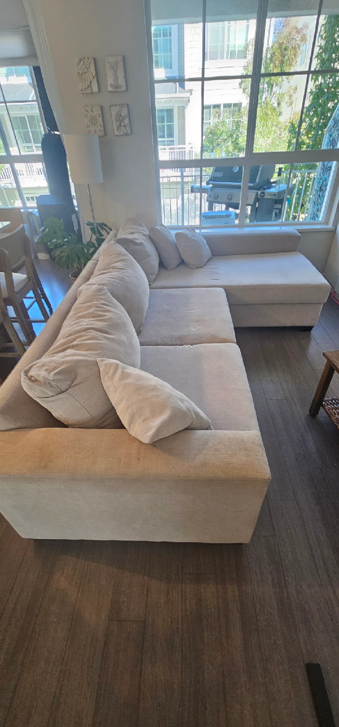 28Free comfortable beige sectional sofa. It comes with several pillows to complete the look. Perfect for a living room or family room! Some light stains, needs a good cleaning. Only 3 years old. Kids spill alot. Lol