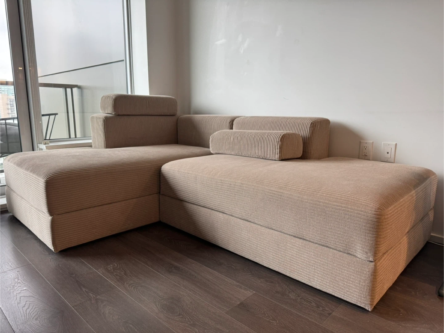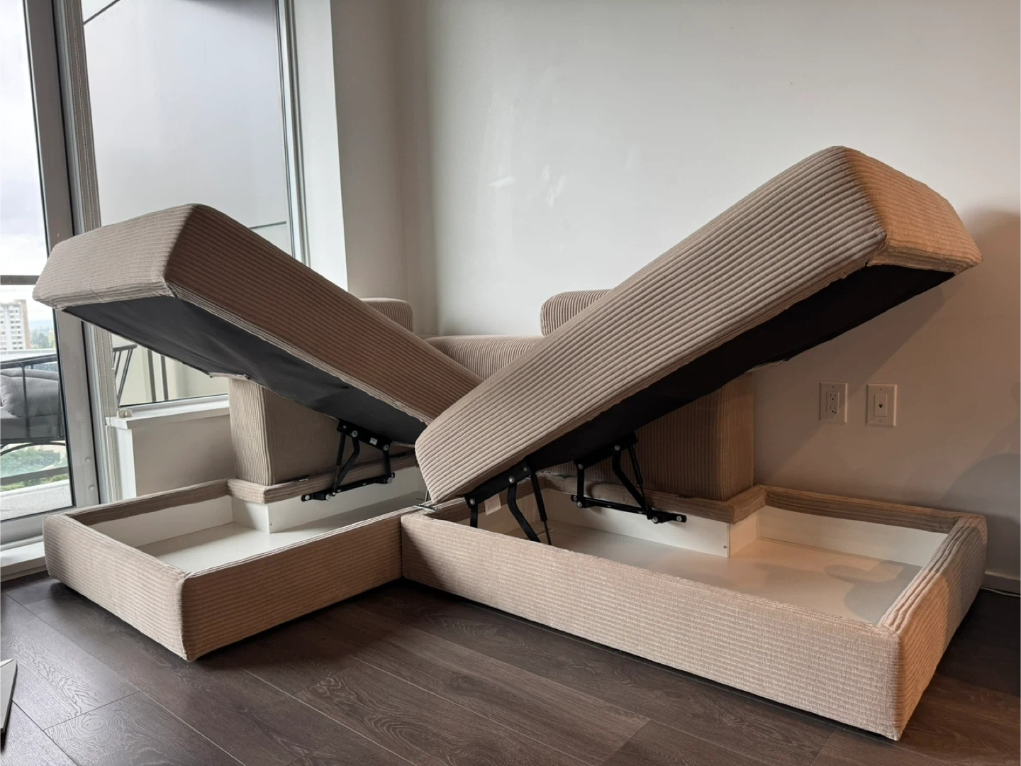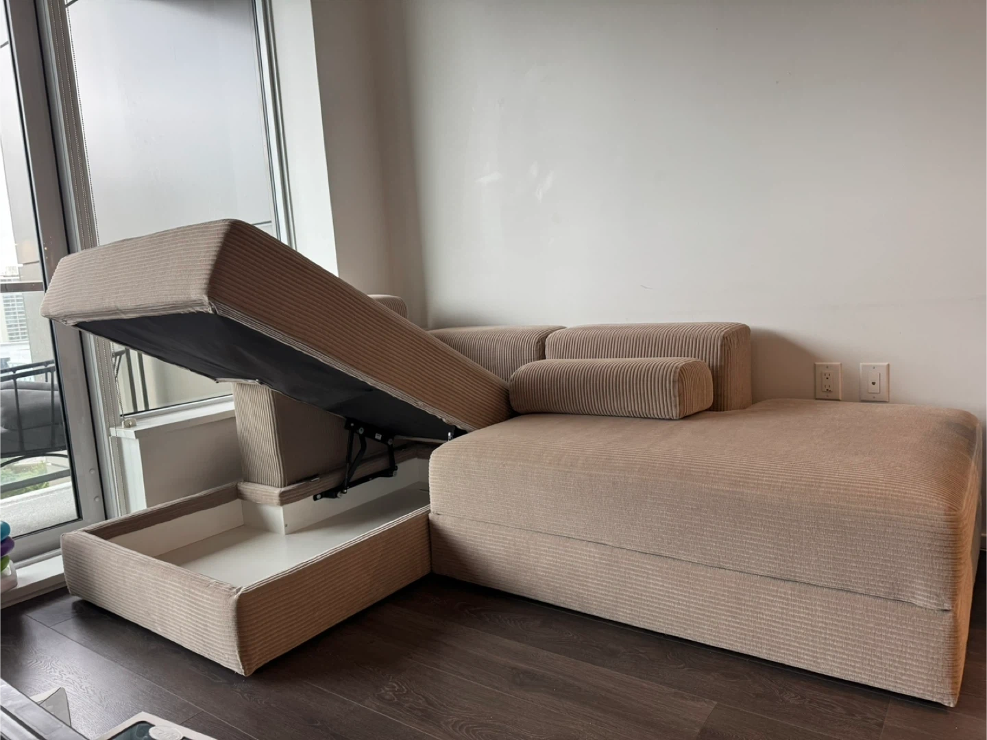 Sofa with Double Storage in Great Condition (1 year of use). Comfortable and practical 3-seater sofa featuring two spacious hidden storage compartments perfect for keeping blankets, toys, or anything you want neatly tucked away. - Neutral color that fits any décor - Easy to clean and well-maintained - Smoke-free, pet-free home Pickup in the amazing Brentwood.