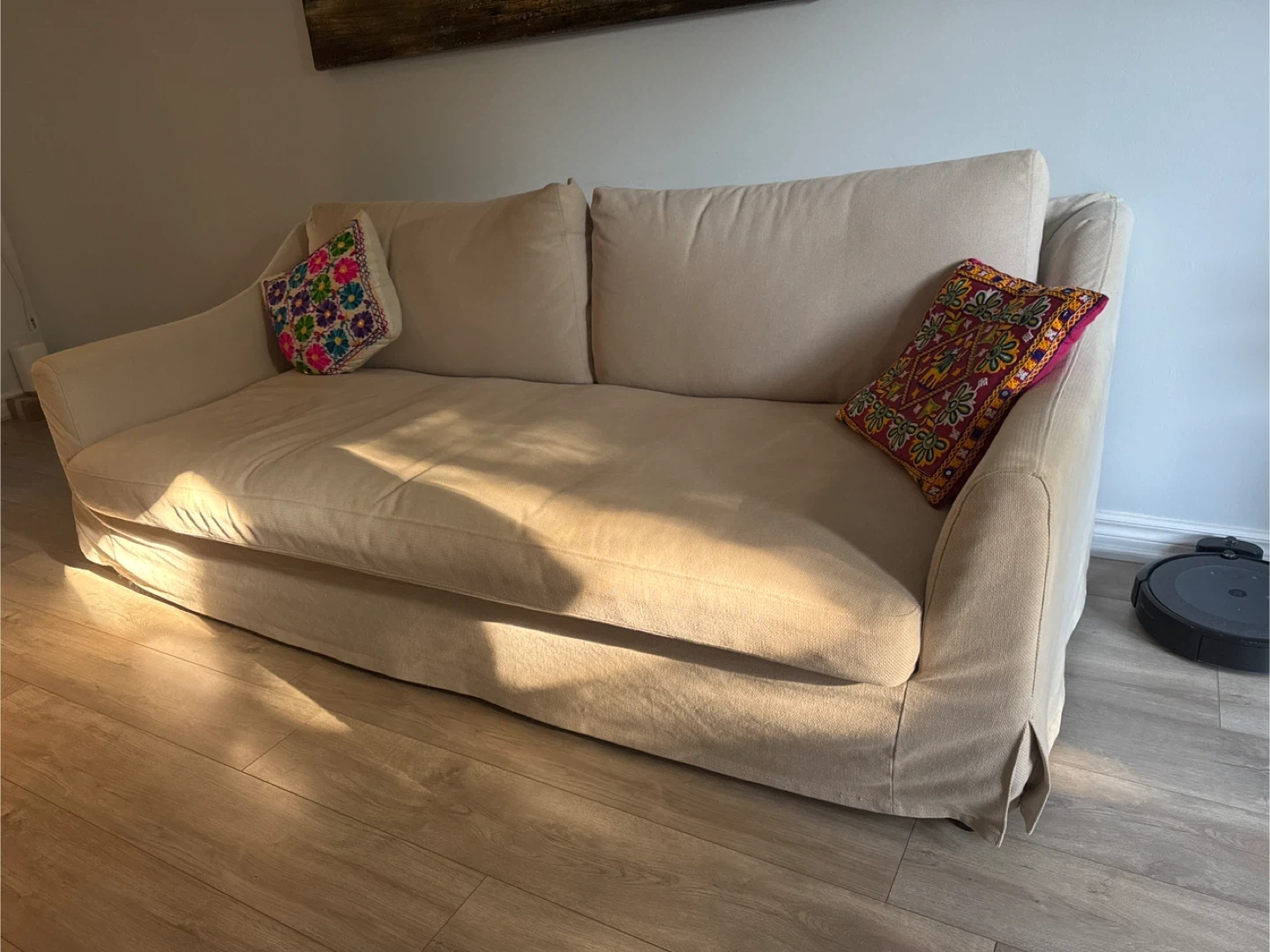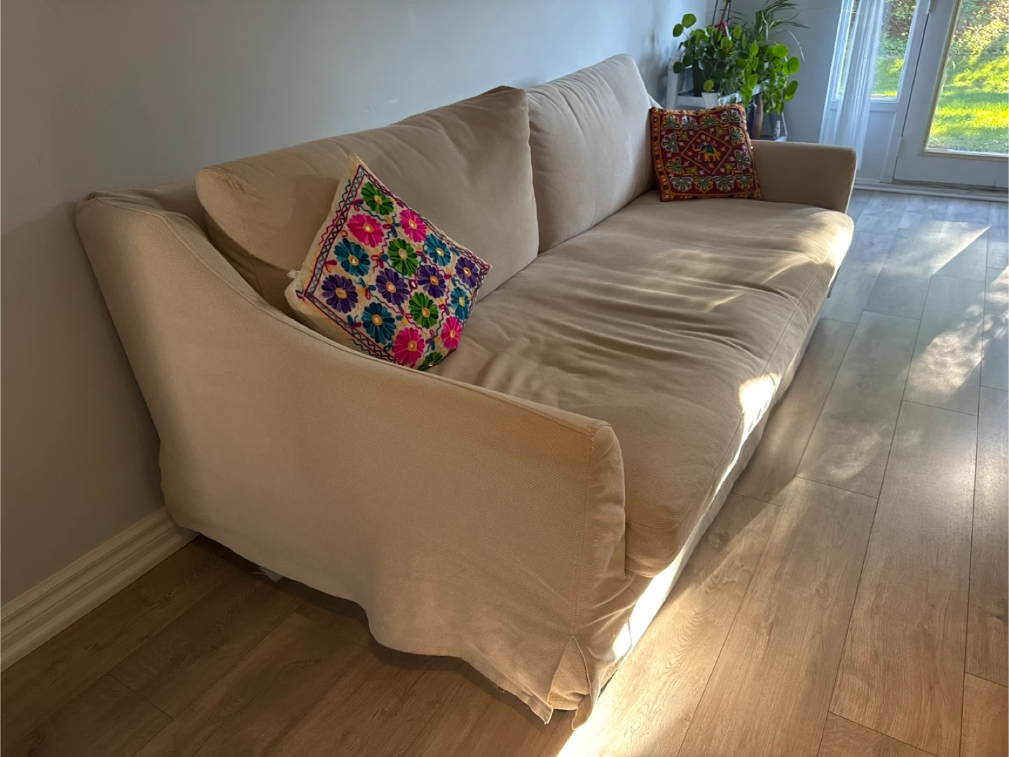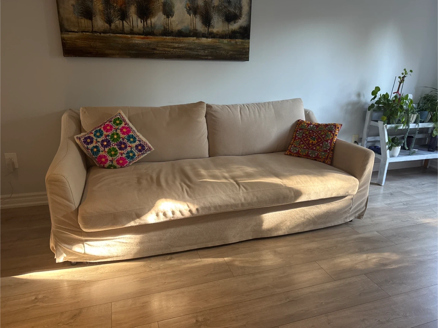 Selling a comfy beige used sofa! It's about 2.18 meters long, perfect for a living room or den. It's in good condition and ready for a new home! Removable covers - so you can wash them