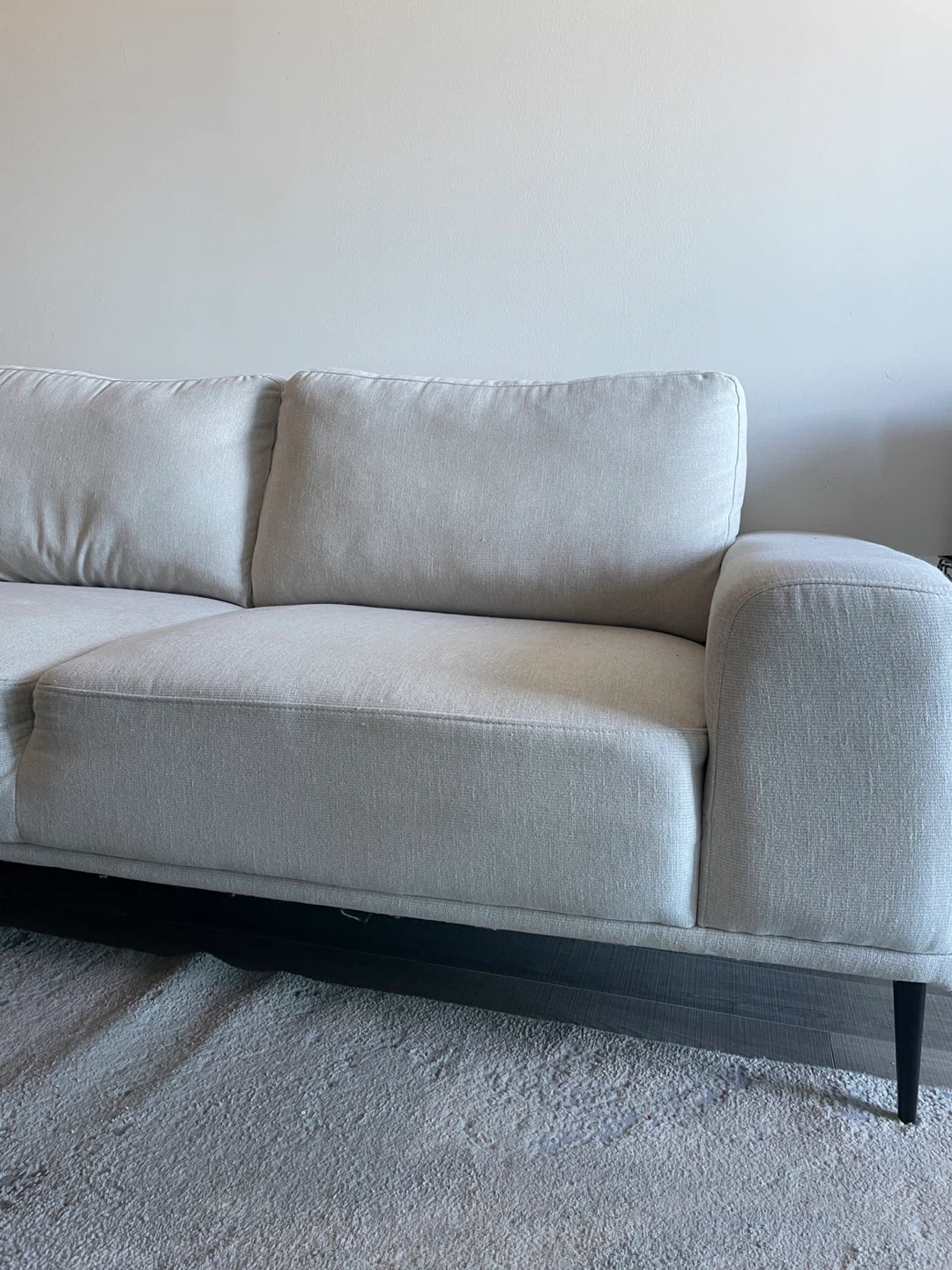 85Selling a comfy beige sofa that's in great condition! It's perfect for a living room or den. The neutral colour will fit in with any decor. If you're looking for a simple and comfortable sofa, this is a great choice! Size: 2 M*90 CM* 55 CM