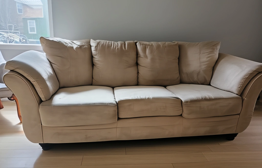 The sofa features rounded arms. It has three seat cushions and three back cushions. The sofa sits on short, black legs. This sofa is a perfect piece for cozy nights in. Looking for the perfect blend of style and comfort for your living space? This beautiful Sofa in Beige is ready to find its new home! Key Features: * Modern Design: With its clean lines and soft beige tone, this sofa easily complements any contemporary decor. * Supreme Comfort: Featuring overstuffed cushions and padded, flared arms, it offers an incredible oasis of coziness for you and your family. * Durable & Easy Care: Made with a durable, super-soft microfibre fabric, it's designed to stand up to daily wear and tear and is surprisingly easy to clean – perfect for everyday living! Condition: Very good used condition. Carefully maintained in a pet-free and smoke-free home. Reason for Selling: We're moving and sadly can't take it with us! Dimensions (approximate - from Leon's site for Collier Sofa): * Width: 89 inches (226 cm) * Depth: 37 inches (94 cm) * Height: 39 inches (99 cm) Price: 250 (Negotiable) Don't miss out on this fantastic sofa that offers both sophisticated style and ultimate relaxation! Message me if you're interested or have any questions!