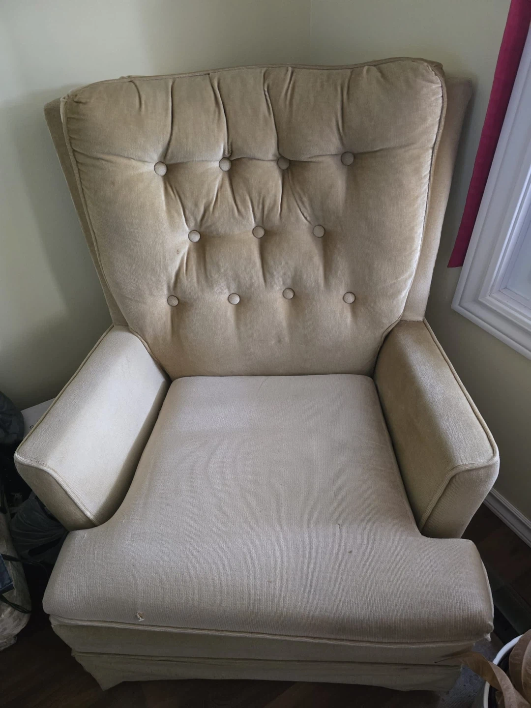 10Comfortable wingback armchair in a neutral beige colour. It's in good condition and would be a great addition to any living room or reading nook. The fabric is soft and inviting, perfect for relaxing after a long day. Pick up Fort Richmond