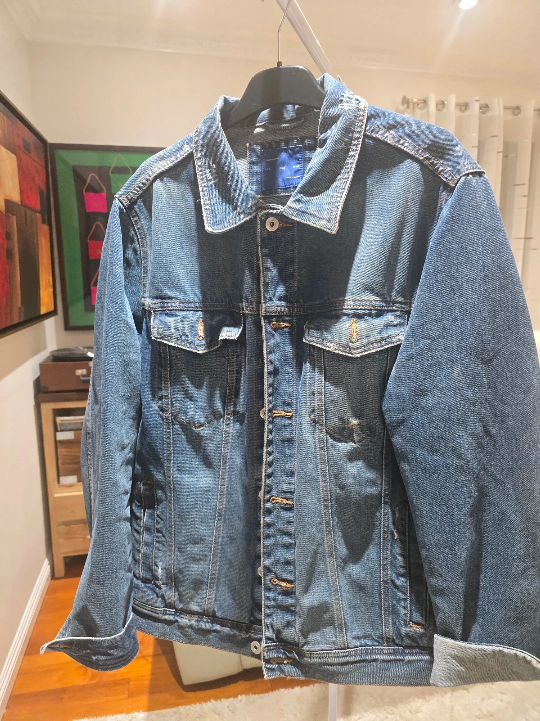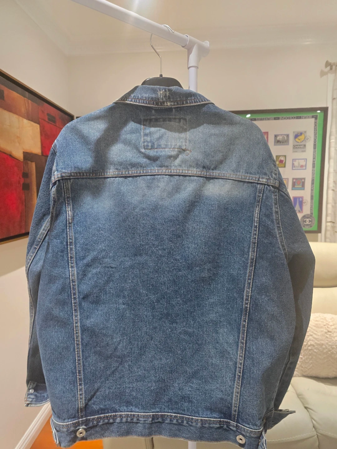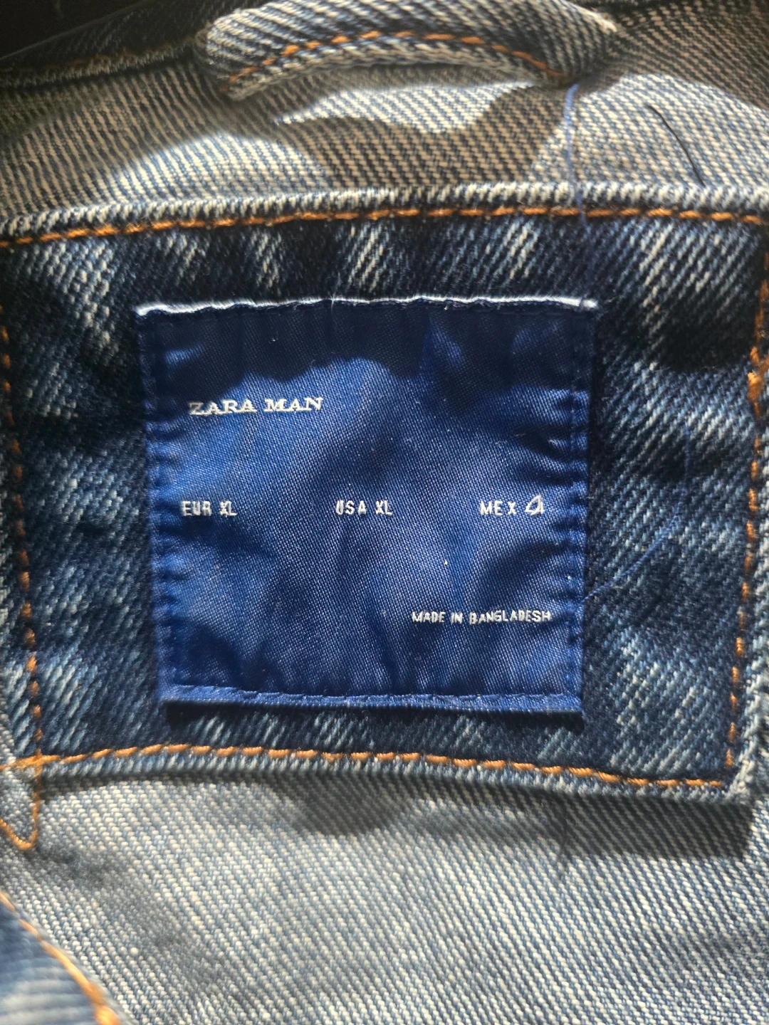 Classic blue denim jacket from Zara Man. Features button-up closure and two chest pockets. Made in Bangladesh. Size is XL.
