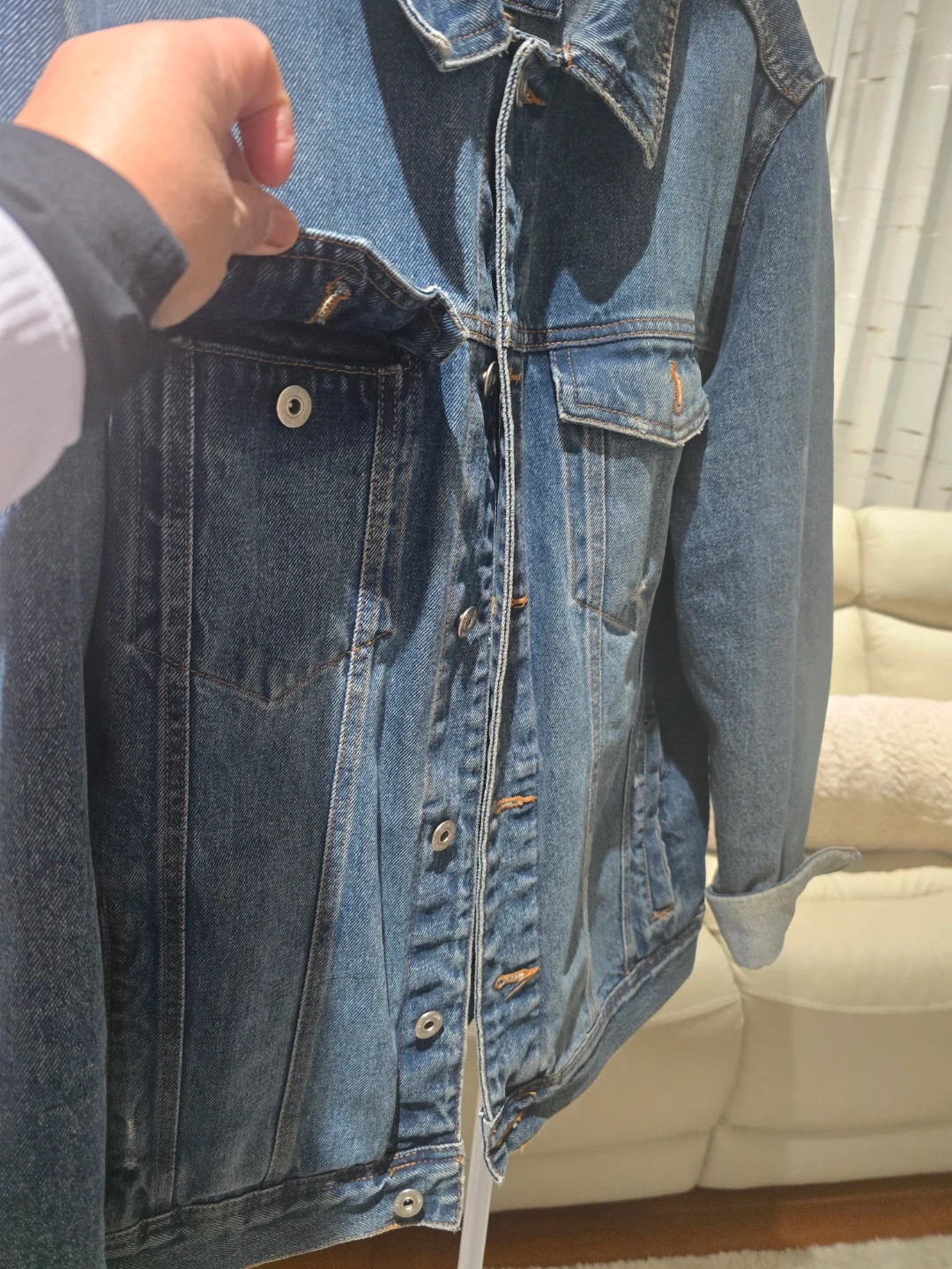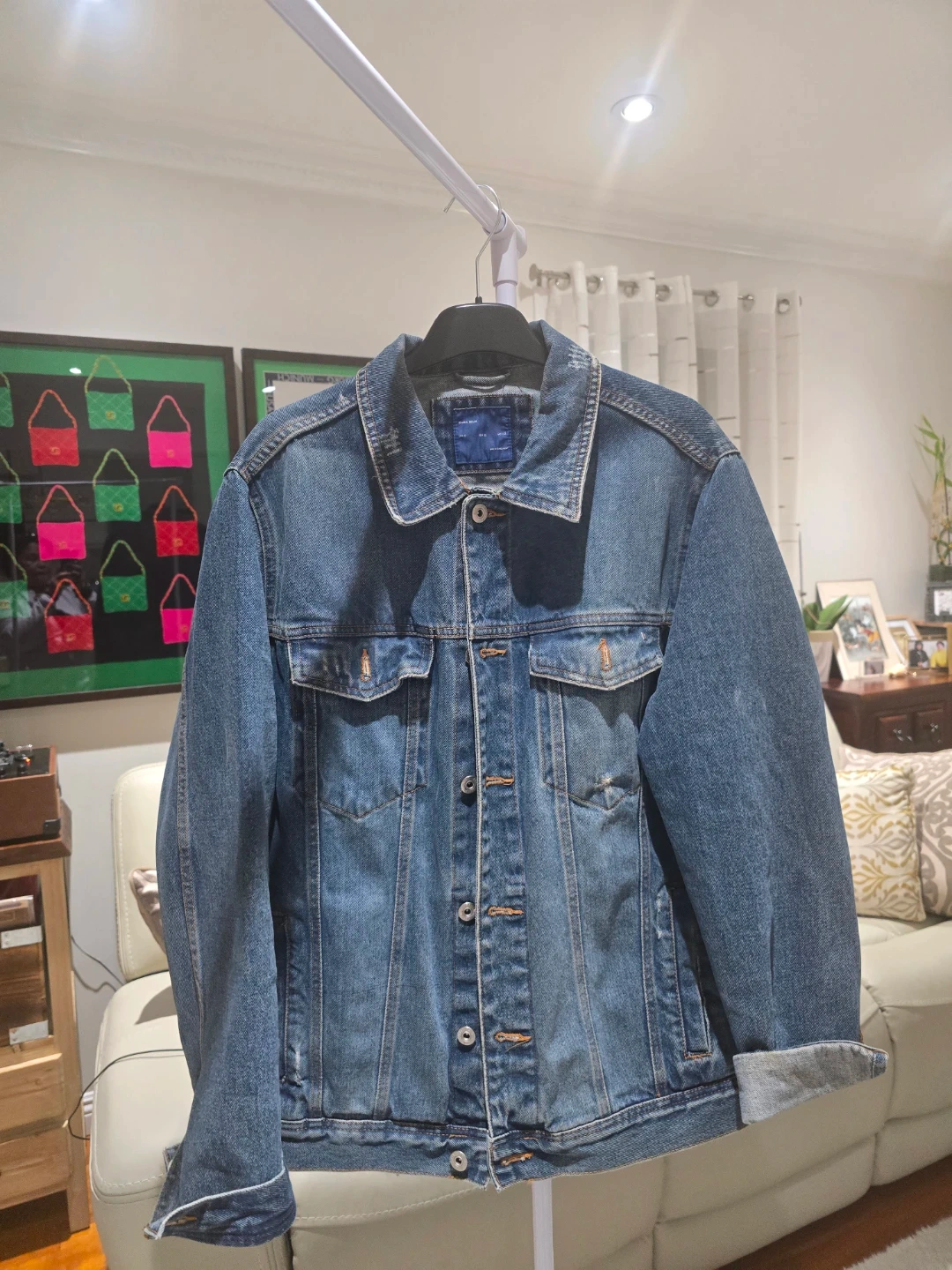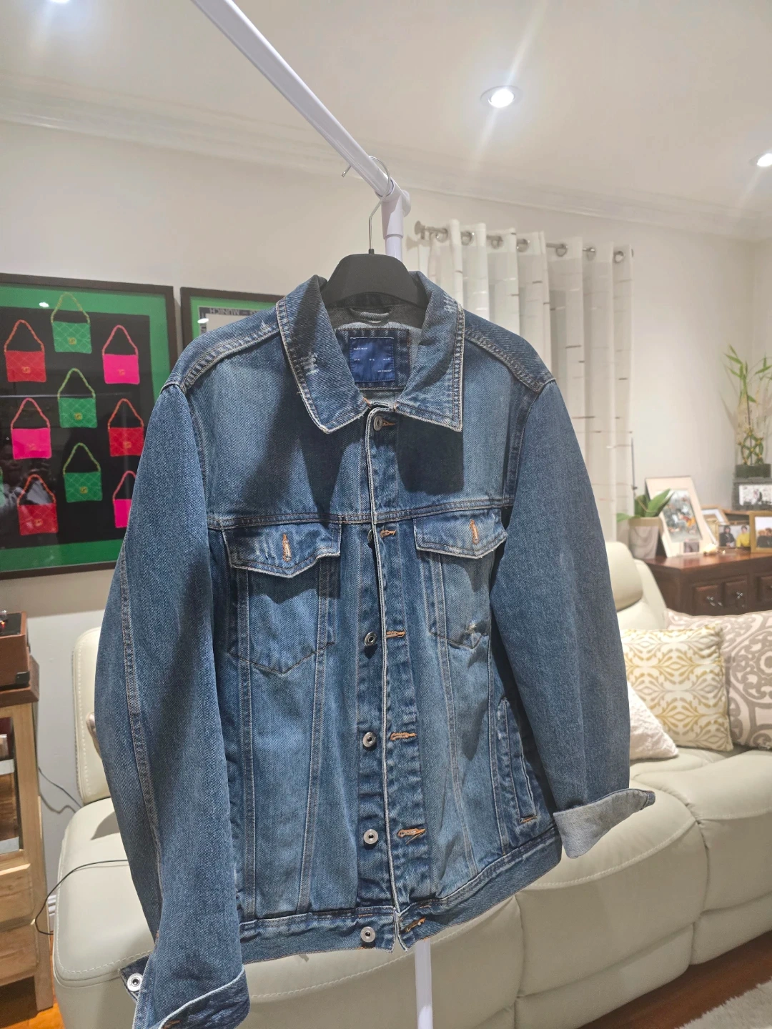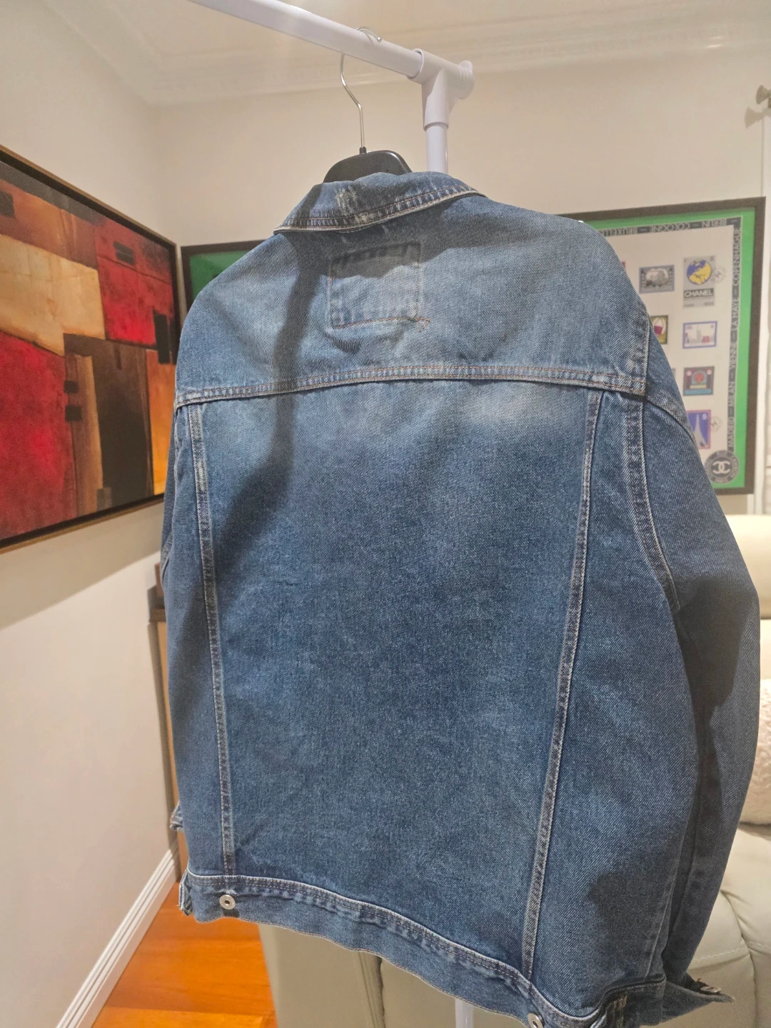 Classic blue denim jacket from Zara Man. Features button-up closure and two chest pockets. Made in Bangladesh. Size is XL.