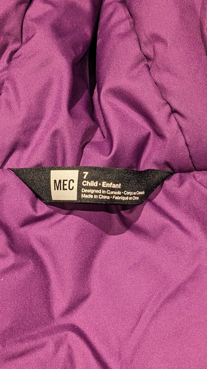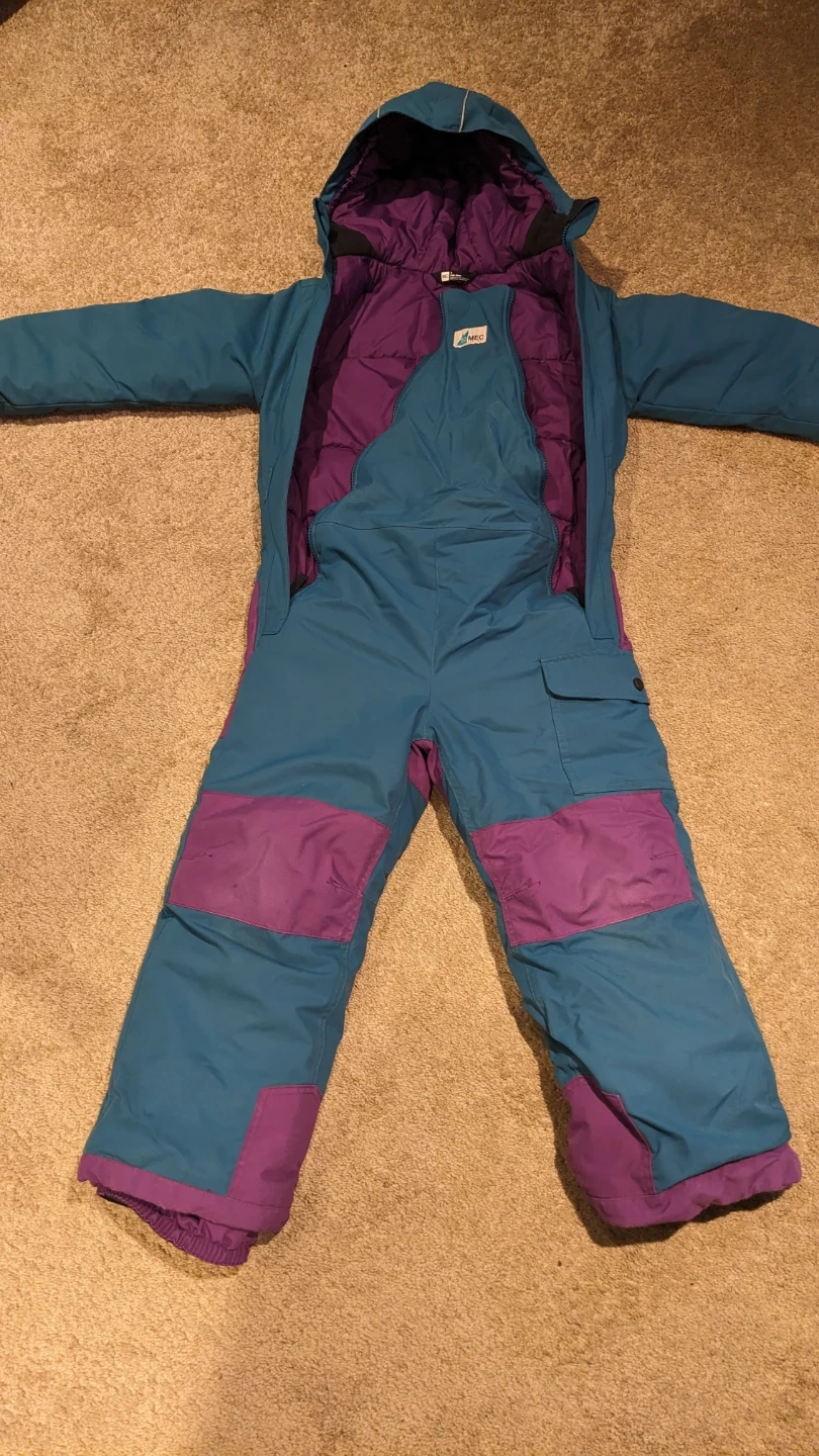 Teal and purple MEC toaster suit. Size 7, fits true to size (if not a little big). It's in excellent shape, no rips/tears/frayed cuffs. A steal at $80!