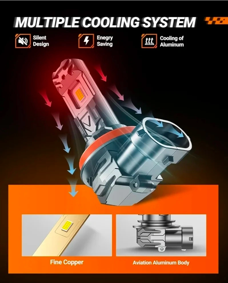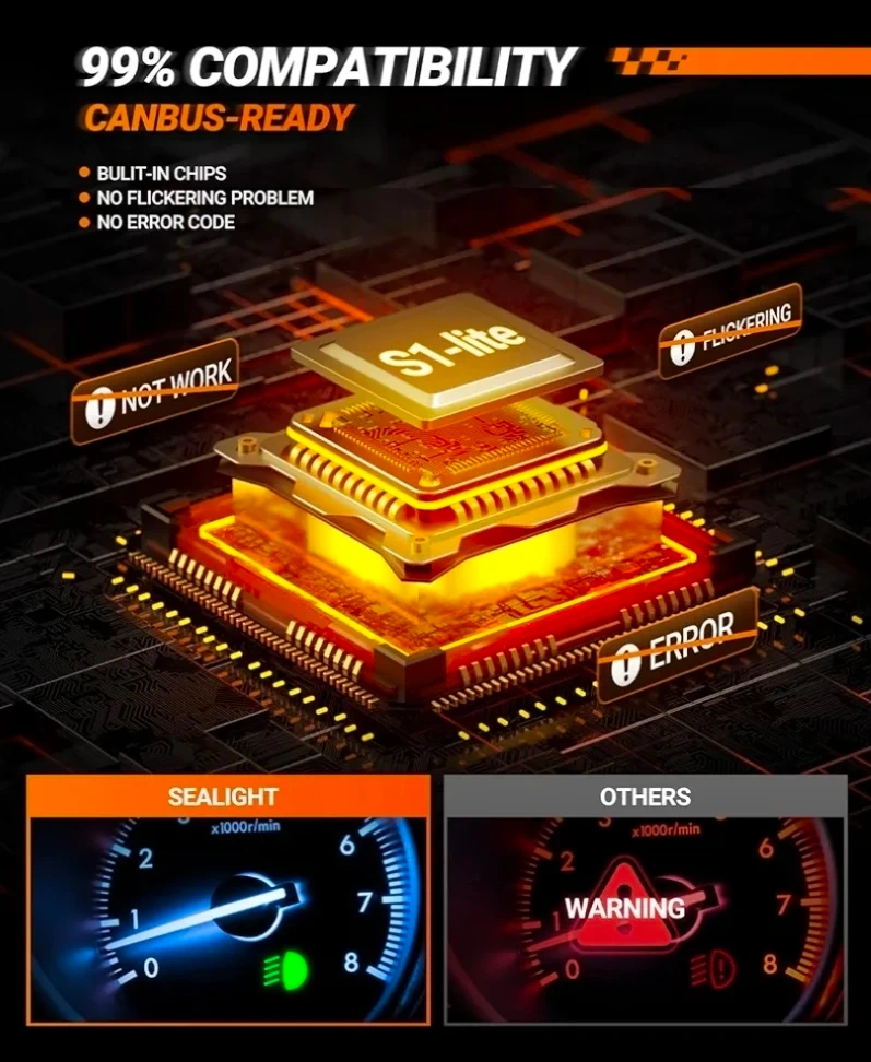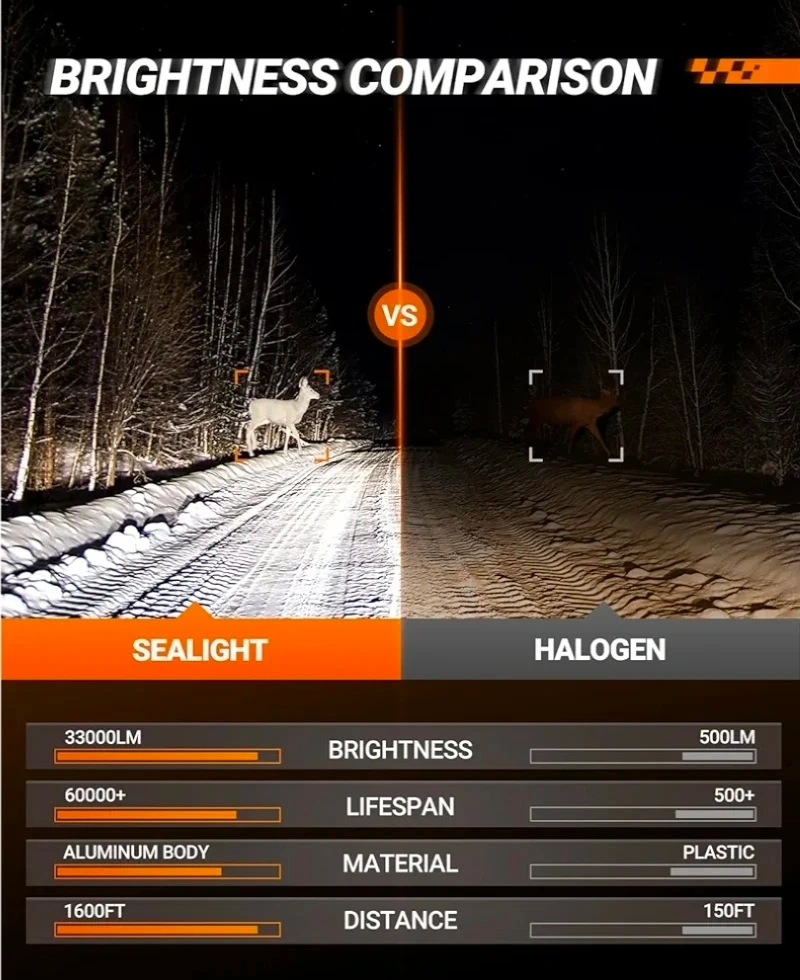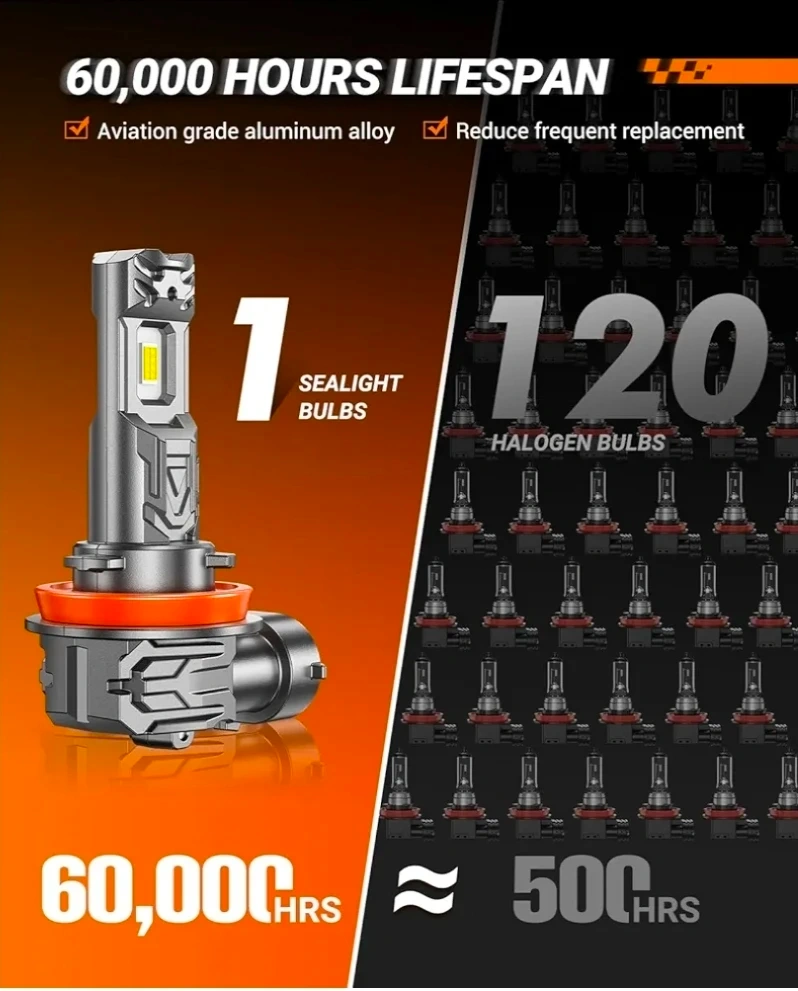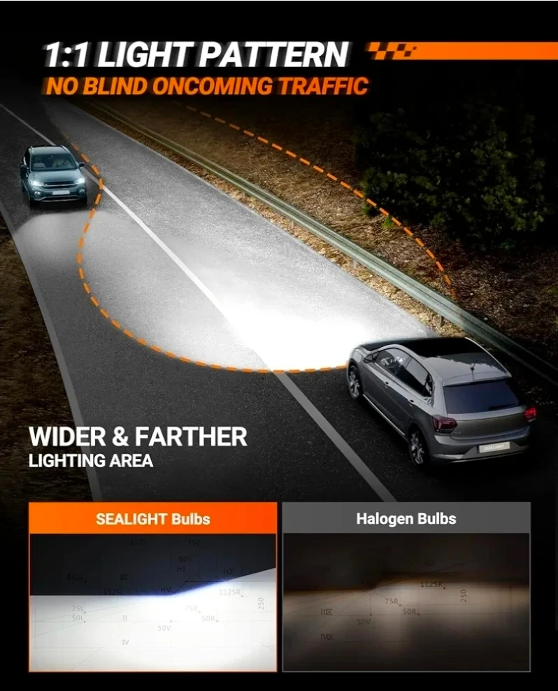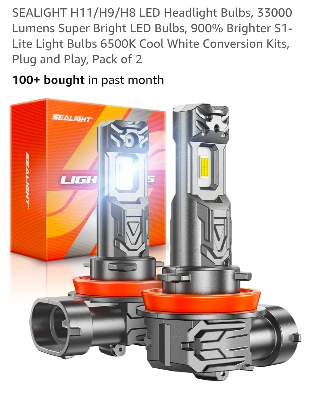 Selling a new pack of SEALIGHT H11/H9/H8 LED Headlight Bulbs! These bulbs are super bright and provide 33000 Lumens. They are 900% brighter than standard bulbs and feature S1-Lite technology. They are designed for plug and play installation and come in a pack of 2. The bulbs have a 6500K cool white conversion kit and are CANBUS-ready, meaning they have built-in chips to prevent flickering and error codes. They also feature a multiple cooling system with a silent design, energy saving technology, and aluminum cooling. They have a fine copper element and an aviation aluminum body.