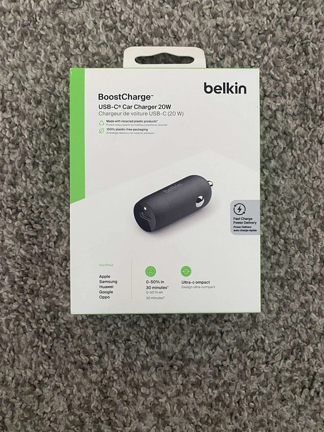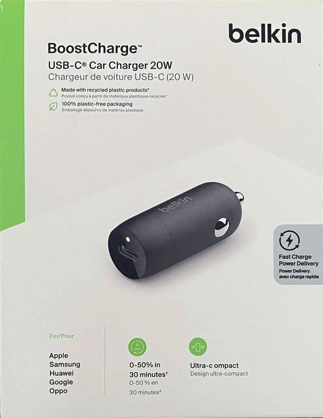 20Charge your devices quickly and sustainably with the Belkin BoostCharge USB-C Car Charger. Engineered for speed and compatibility, this 20W charger powers up your smartphone from 0–50% in just 30 minutes, making it ideal for busy commutes and road trips. Product Features: • 20W USB-C fast charging • Compatible with Apple, Samsung, Huawei, Google, and Oppo devices • Ultra-compact design for easy storage and use • Made with recycled plastic materials • 100% plastic-free packaging Included: • Belkin BoostCharge USB-C Car Charger (cable not included) This item is brand new, unused, and comes in eco-conscious packaging.