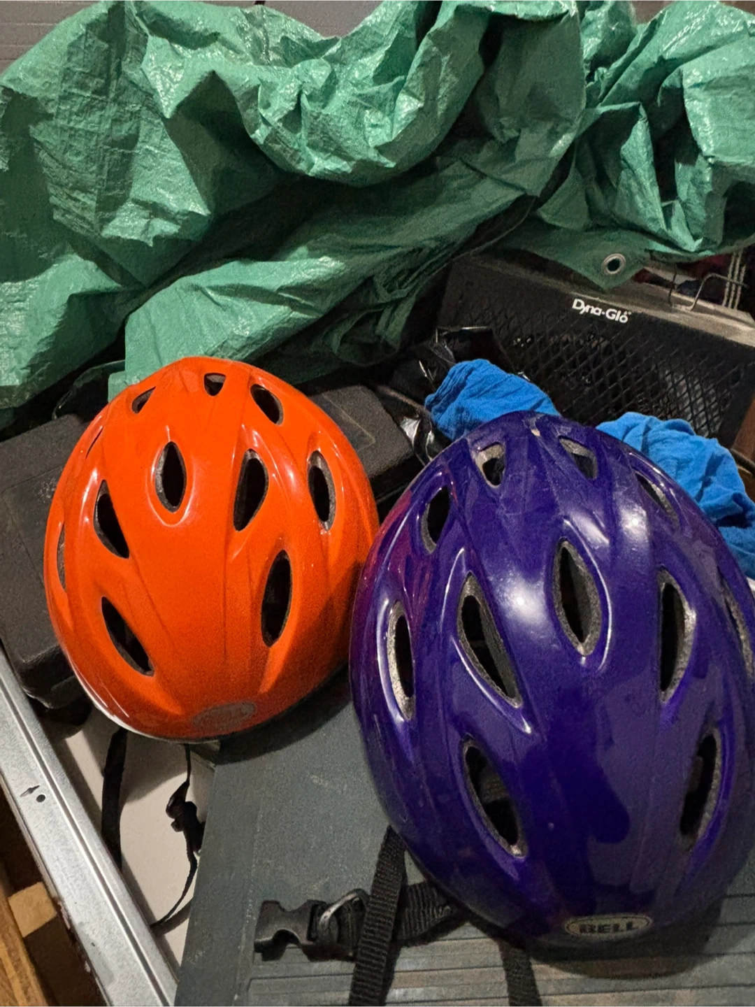 12Two Bell bike helmets for sale! One is orange and the other is purple. They're in good condition and ready for your next ride
