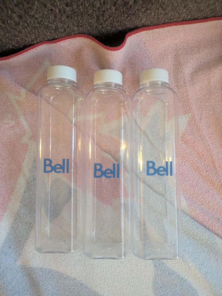 Selling a set of three Bell water bottles. They're clear with a white cap and the Bell logo in blue. Perfect for staying hydrated on the go!