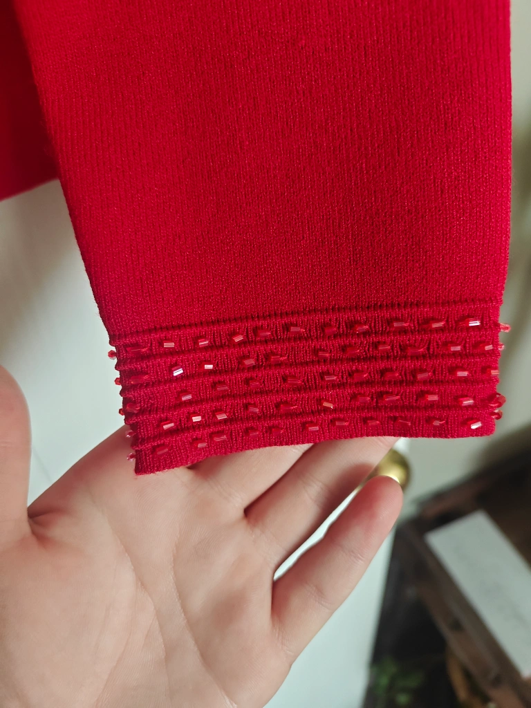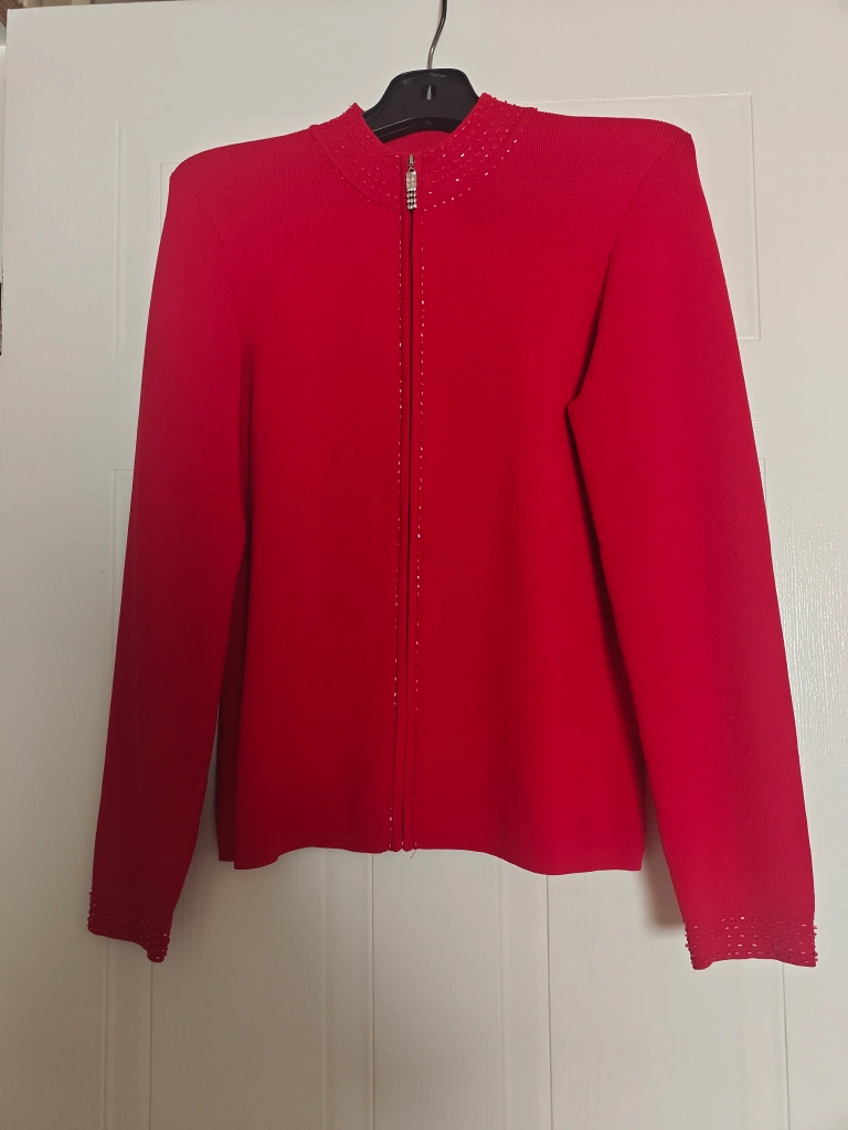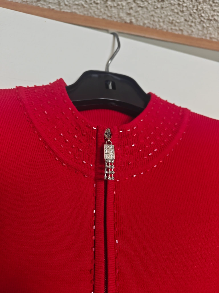 Lovely red knit jacket featuring a jewelled zipper and beaded detailing around the collar and cuffs.
