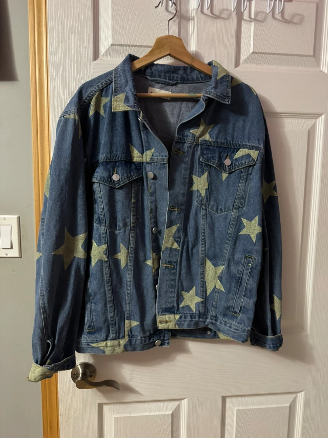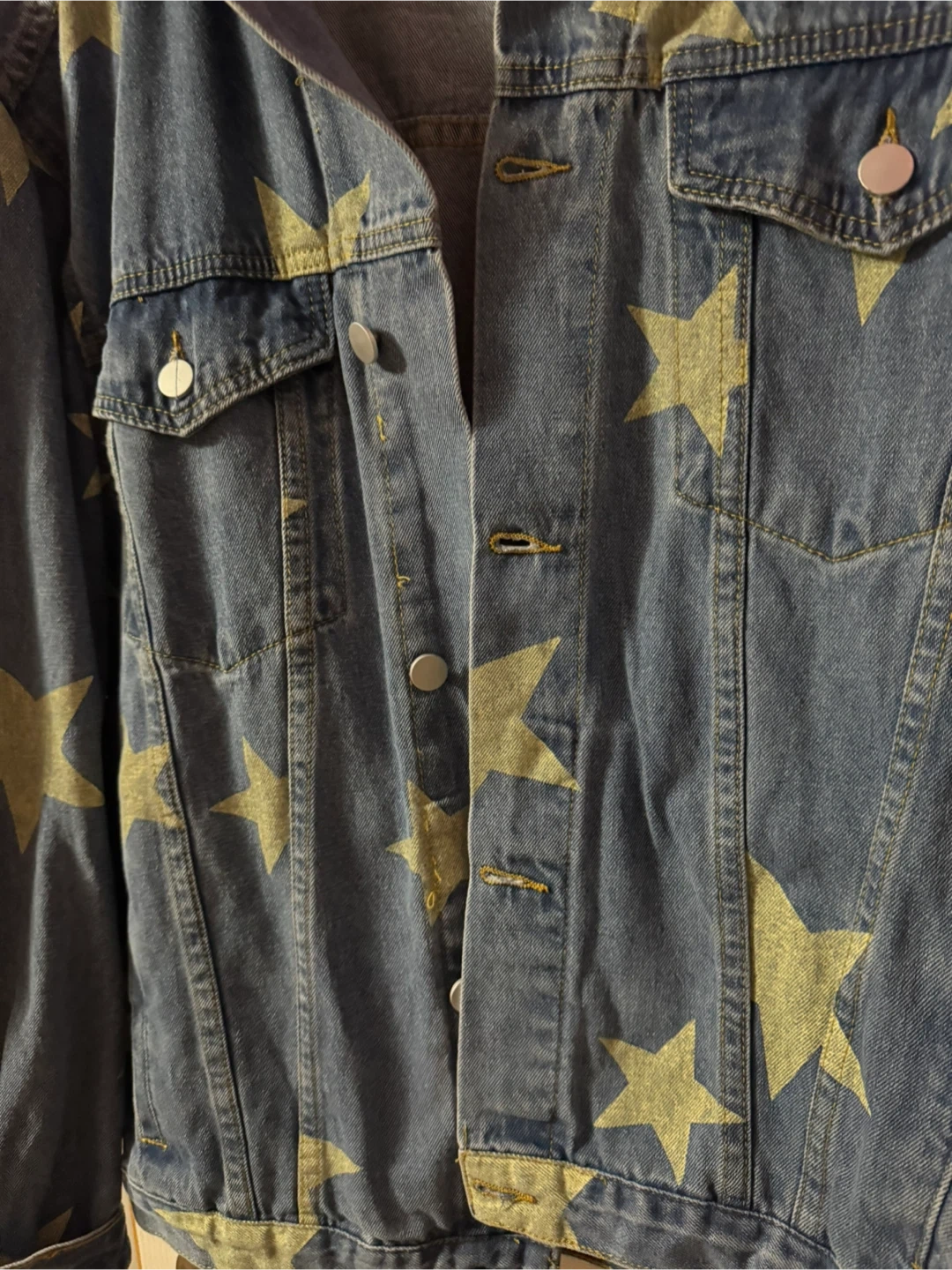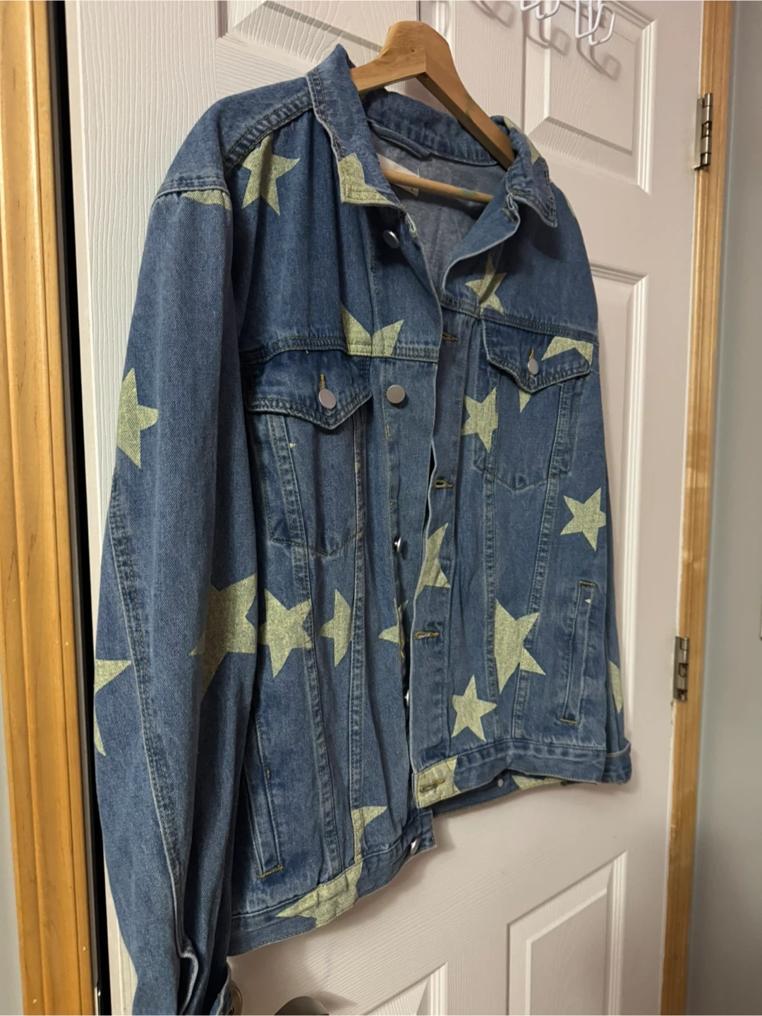Blue denim jacket with a unique all-over star print. Super cute statement piece that looks great with casual outfits, dresses, or layered in fall/spring.