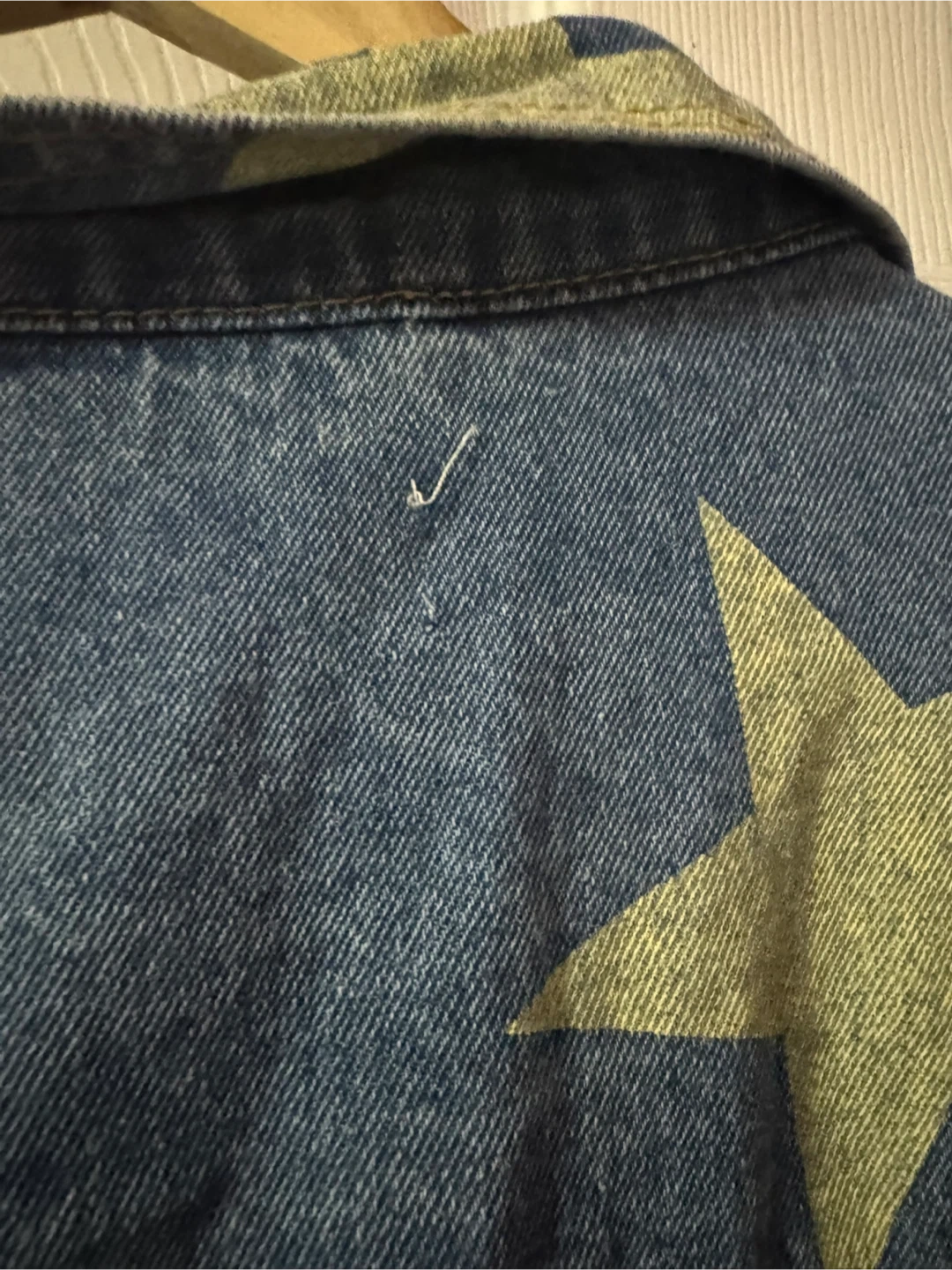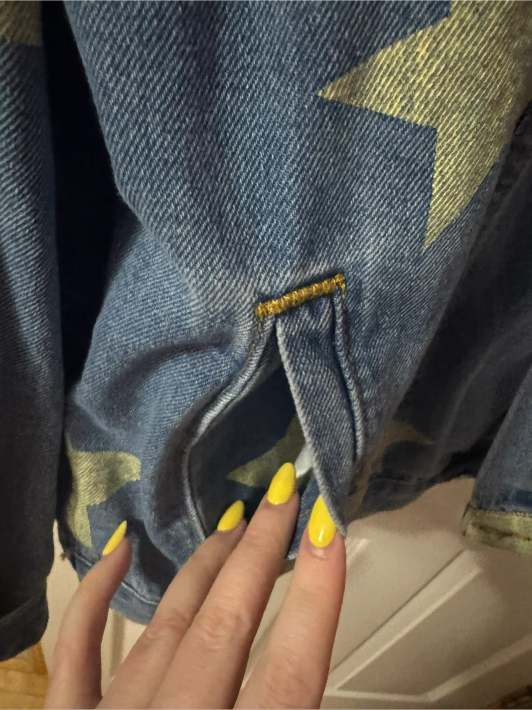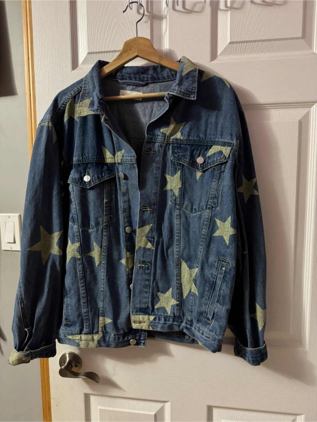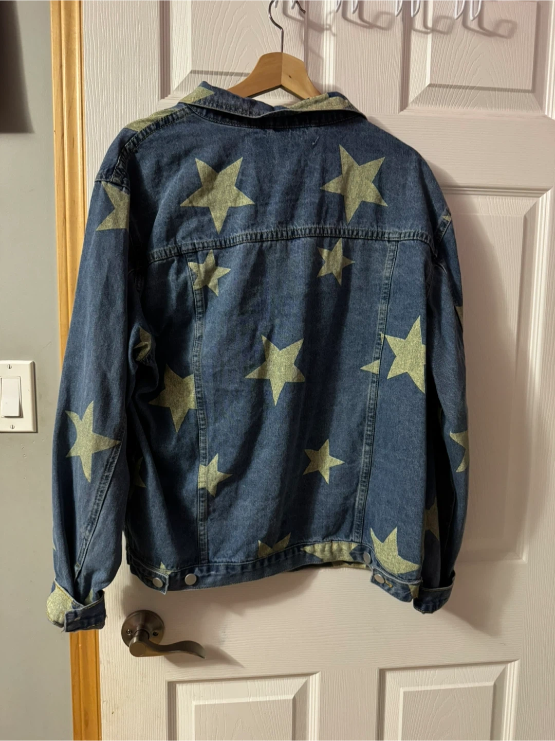 Blue denim jacket with a unique all-over star print. Super cute statement piece that looks great with casual outfits, dresses, or layered in fall/spring.