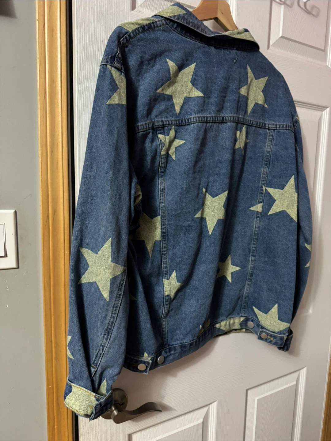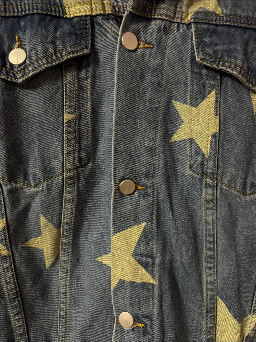 Blue denim jacket with a unique all-over star print. Super cute statement piece that looks great with casual outfits, dresses, or layered in fall/spring.