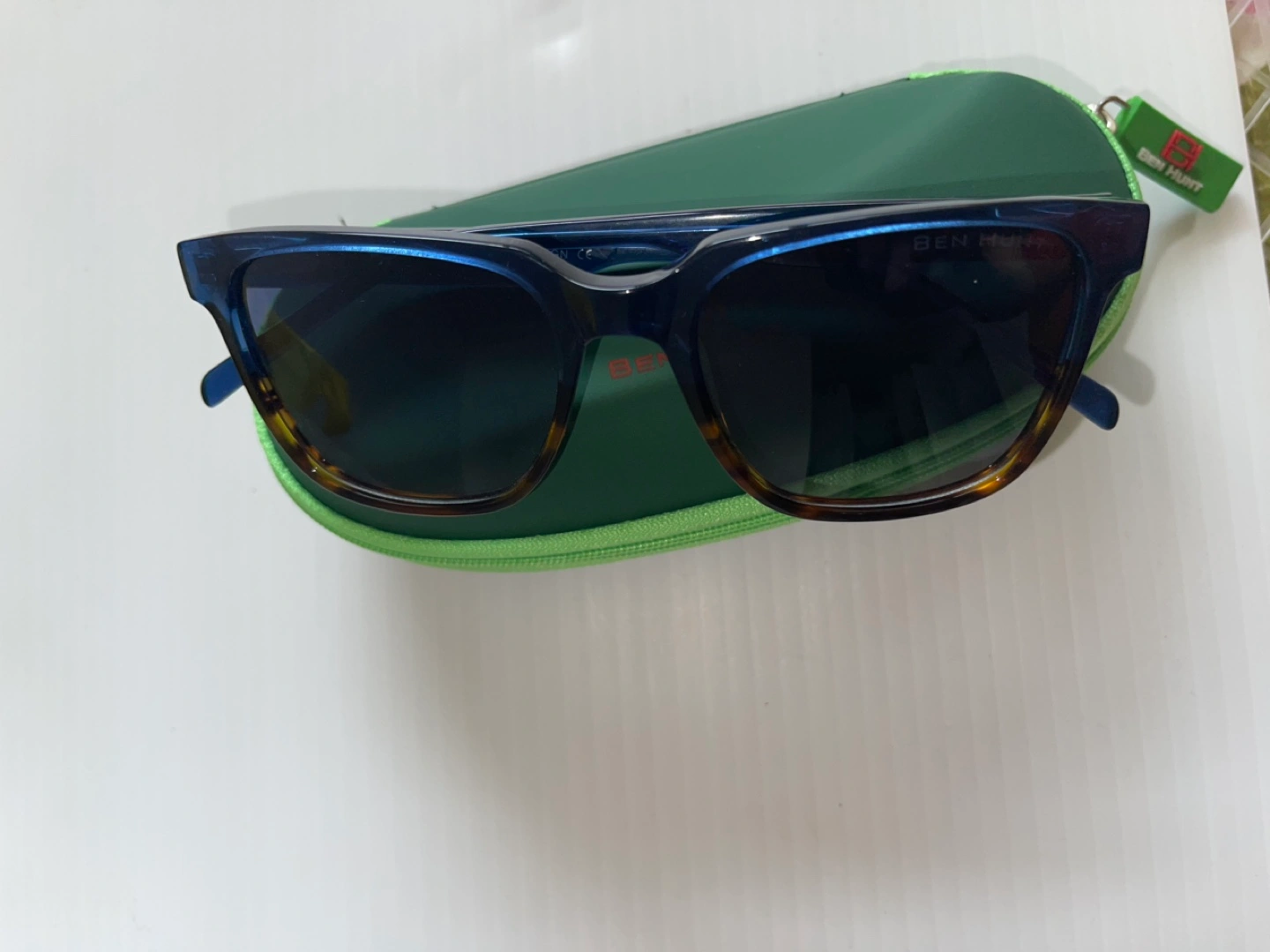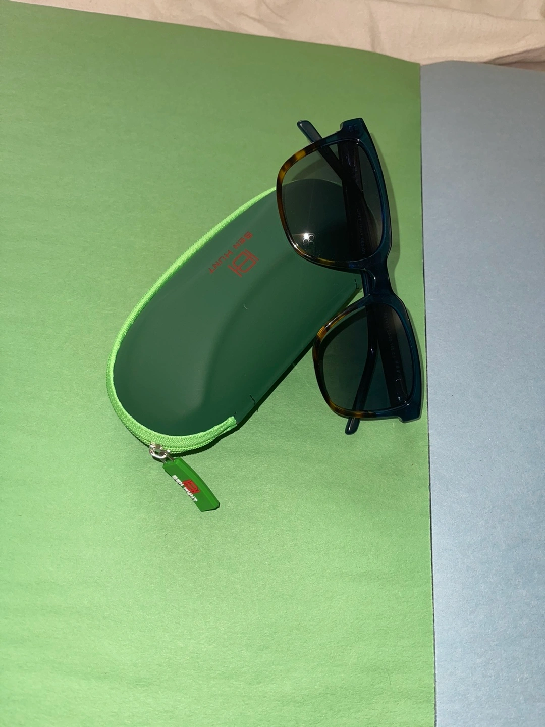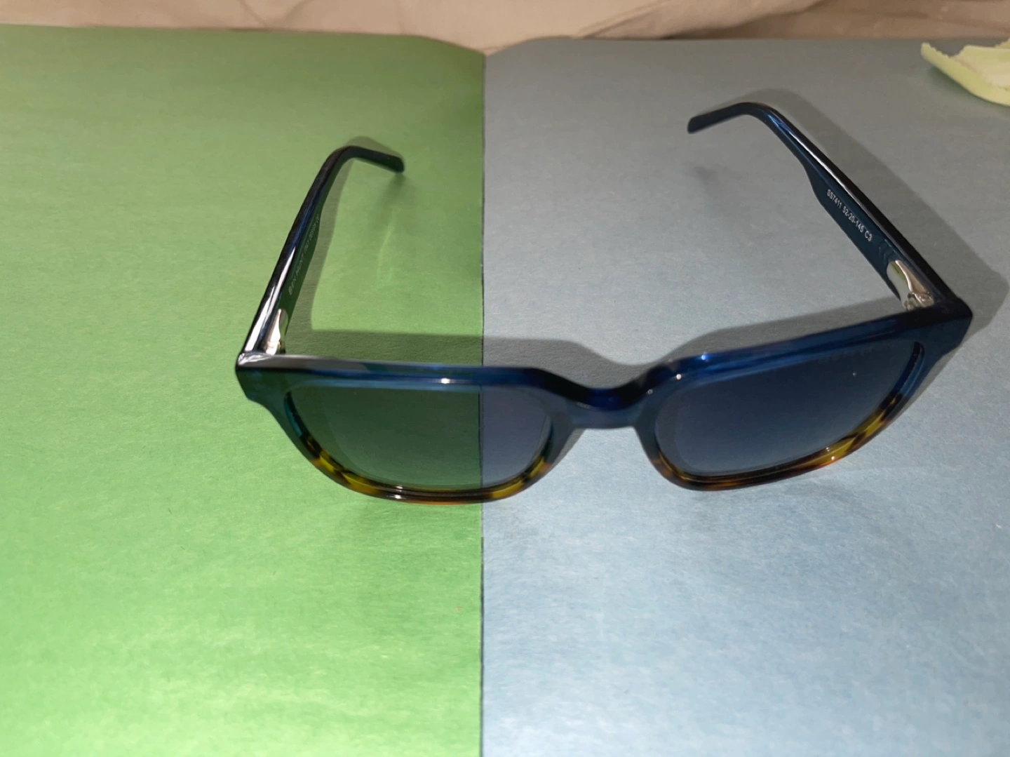 Blue and tortoise shell sunglasses with a green case. They have a gradient lens.