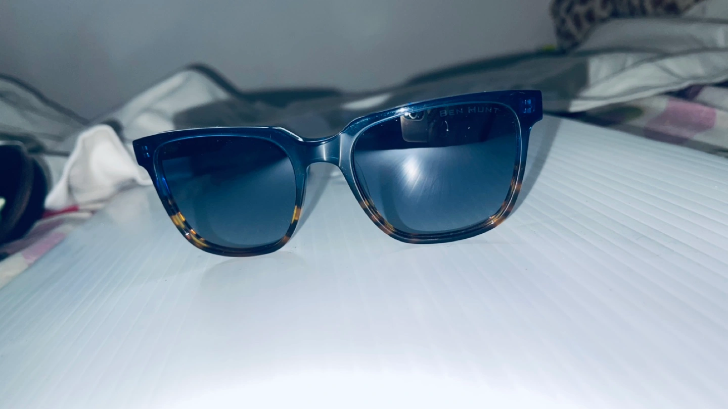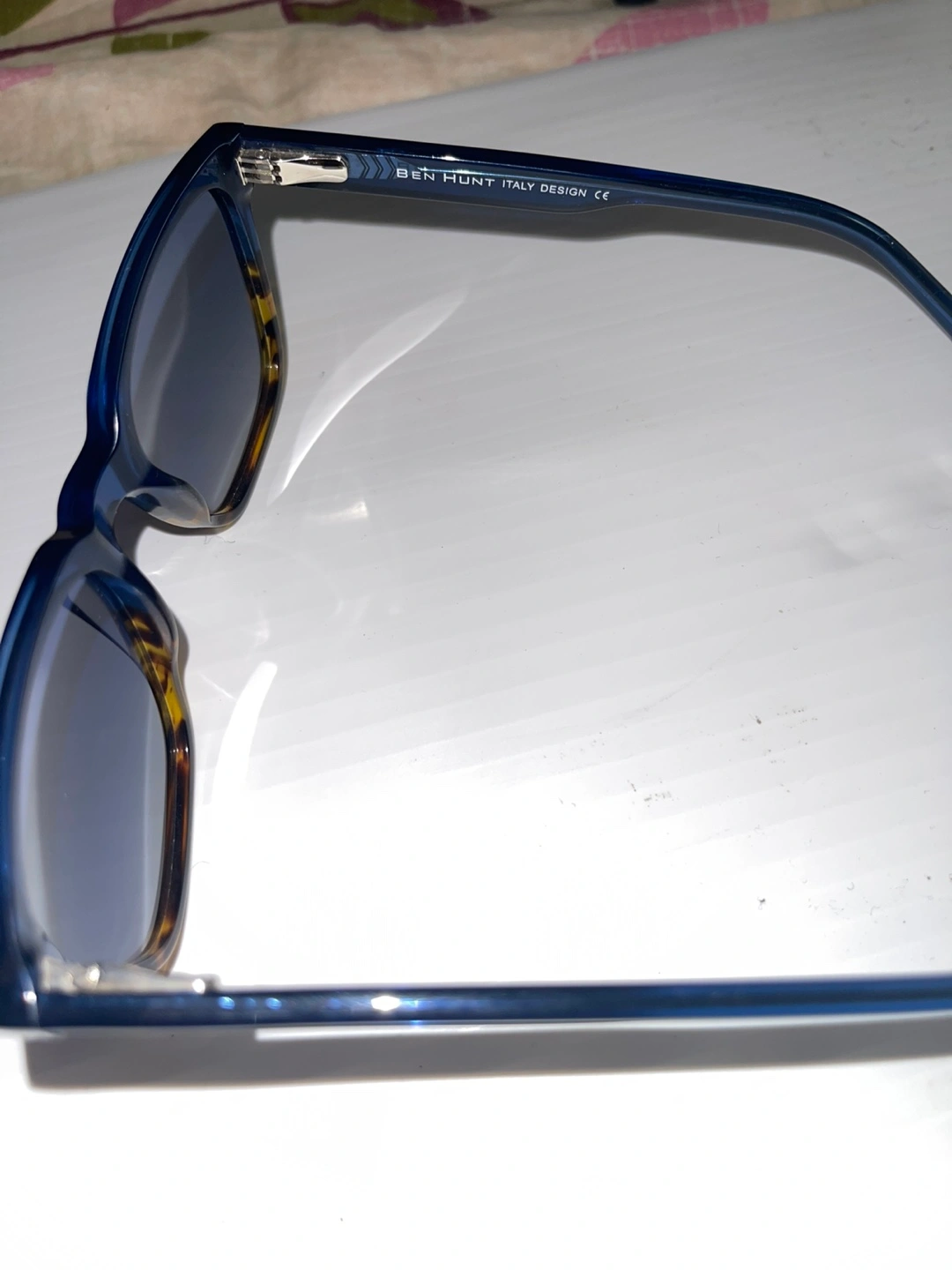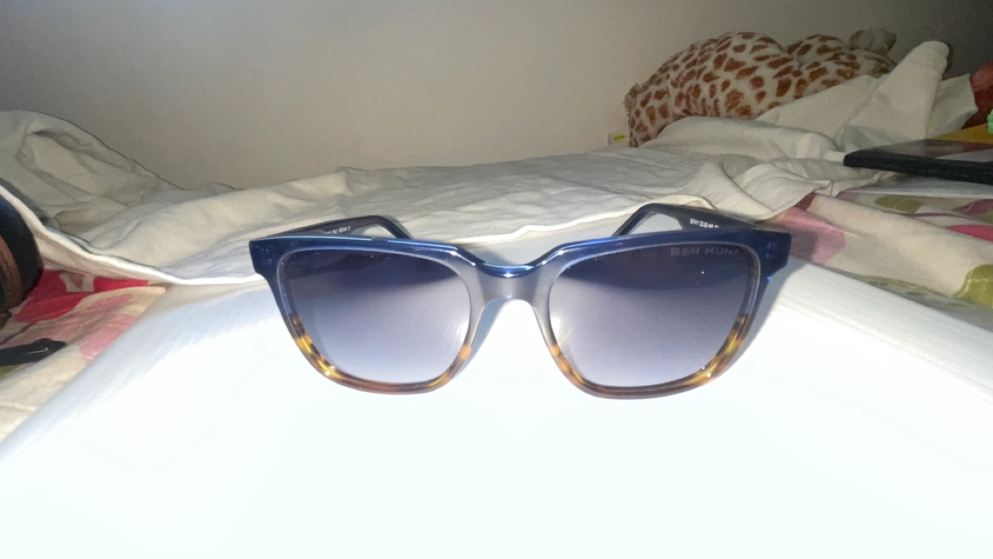 Blue and tortoise shell sunglasses with a green case. They have a gradient lens.