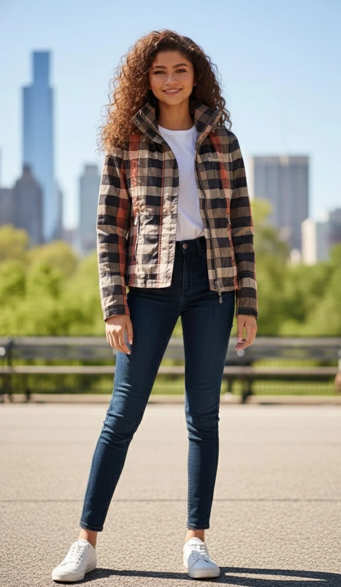 357Bench plaid jacket with a hood which can be tucked in and zipped away in rhe collar. Lightweight stylish plaid pattern in shades of peach, black, and grey. Original price was $120