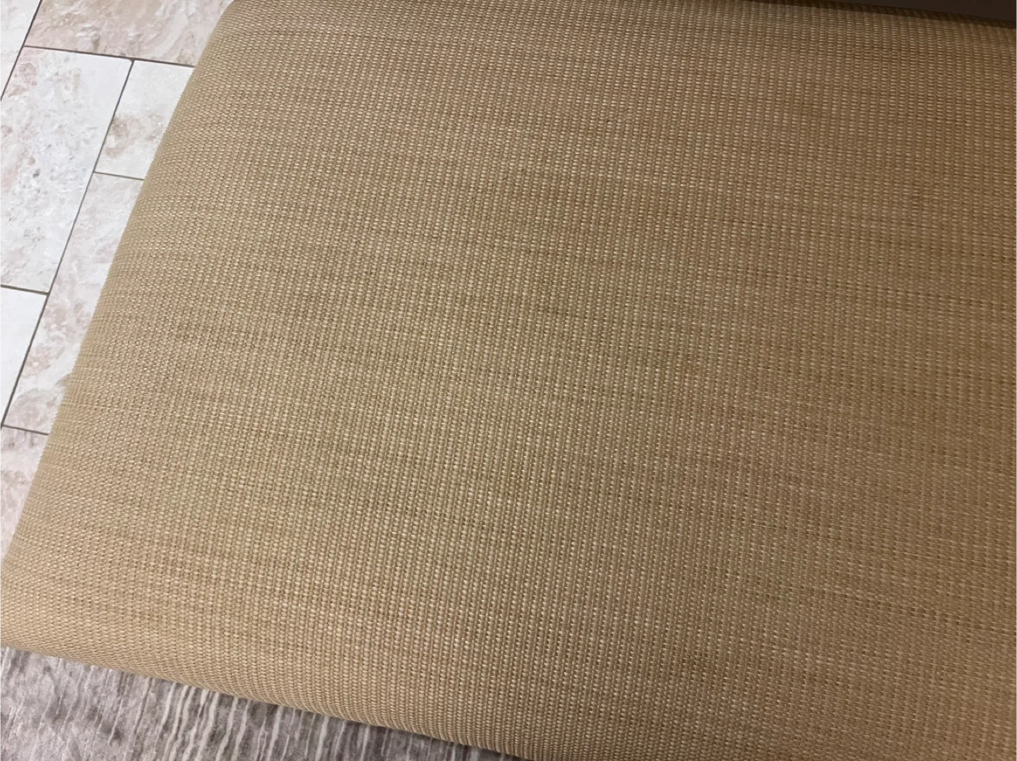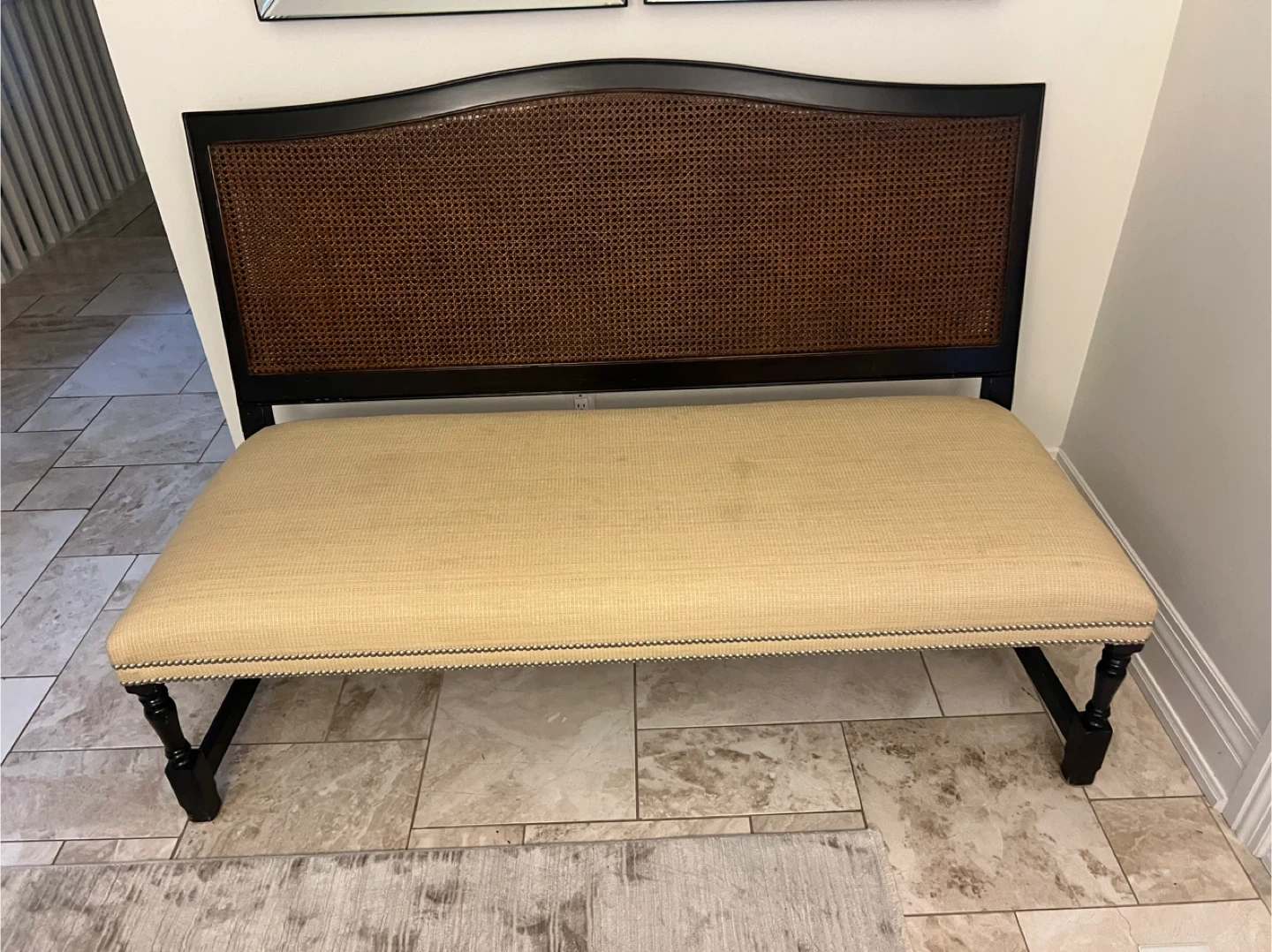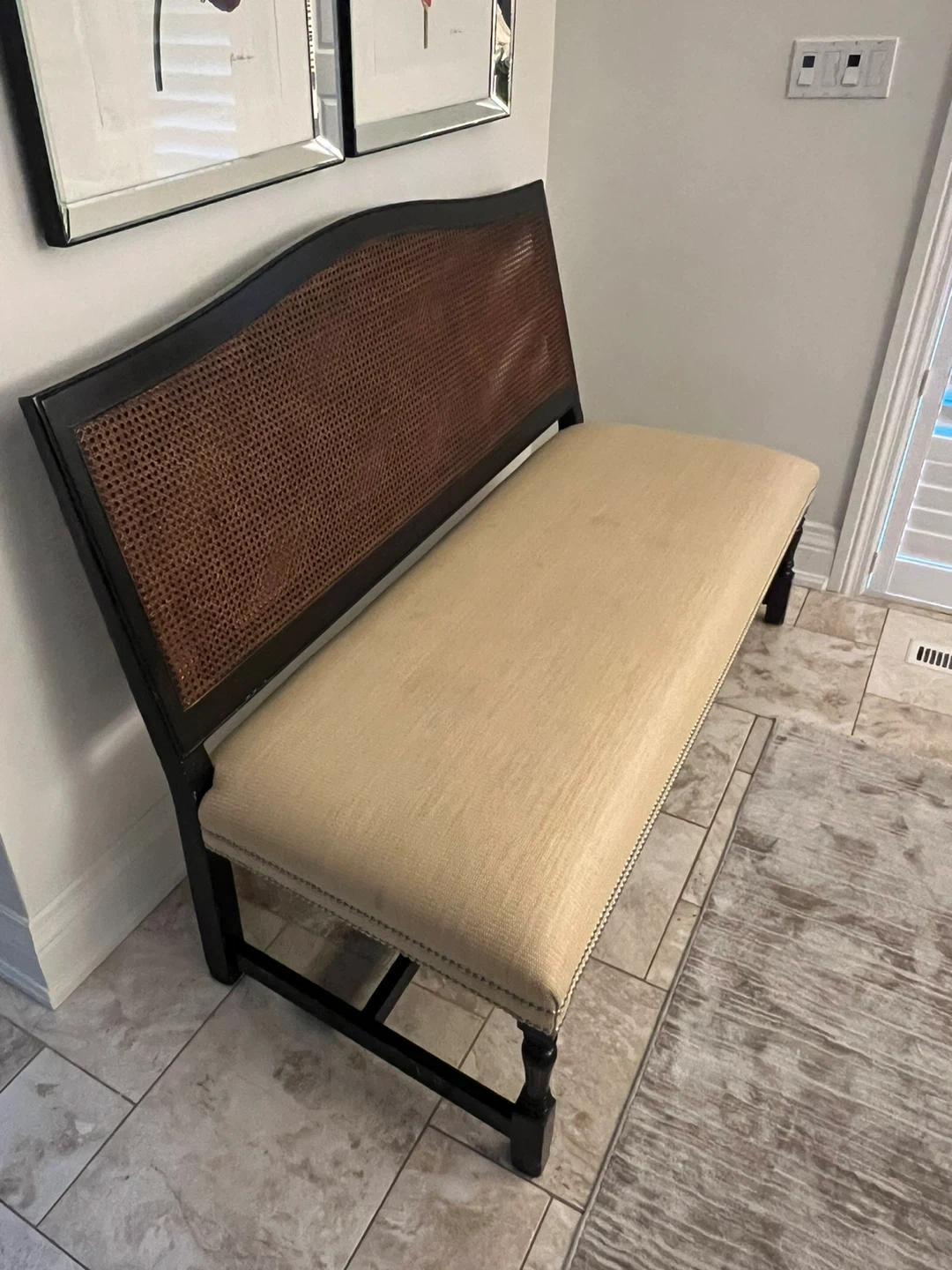 Selling a lovely cane back bench seat. The frame is black with a woven cane back and a light tan upholstered seat. It would look great in an entryway or as extra seating in a living room. In good condition!