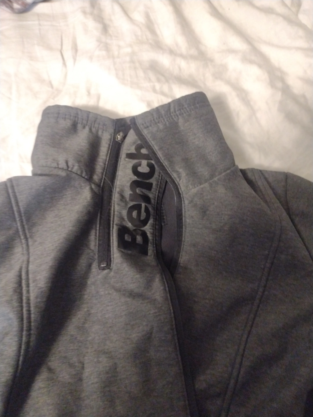 Grey soft shell jacket. Size medium. Features a high collar and zipper closure. Two zippered pockets. Excellent for layering.